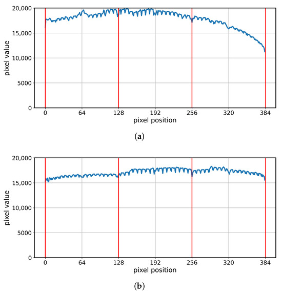To investigate this phenomenon, a FG array was used, as it eliminates the possibility of geometry-related errors influencing the results. The discontinuity on the FG array is shown in Figure 12a. This issue was not observed at the other detector boundary within the same array. Swapping the detectors resulted in a continuous image, indicating that the problem was not related to geometry but rather to the physical characteristics of the detectors. Out of the seven detectors available for testing, five exhibited this issue.