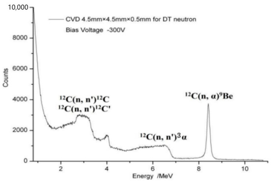 Finally, there is the electrode integration process, which improves the charge collection efficiency by preparing metal electrodes to achieve ohmic contact. Qingfeng Su et al. at Shanghai University systematically characterized the electrical and optical properties of diamond films, which guided the successful synthesis of detector-grade material [9]. On this basis, the Cr/Au double-layer electrode and annealing process were used to realize the ohmic contact between metal and diamond, and a diamond one-dimensional array particle detector was successfully developed. A CVD diamond thin-film detector for pulse amplitude measurements was developed using an opposite sandwich electrode structure with a homogeneous intrinsic diamond thin-film material by Wang Lan [10] and others at Tsinghua University. It can be used for fusion pulsed neutron and pulsed γ-ray measurements, with a dark current lower than 10 pA and a charge collection efficiency of 60–70%, which lays a good foundation for subsequent detector design and development. A diamond neutron detector for deuterium-tritium fusion neutron detection was developed by Xu Ping [11] et al. at Nanhua University, using a single-crystal diamond film with a thickness of 500 μm and a sandwich structure formed by a flat gold electrode and an orbital-shaped gold electrode. The characteristic peaks of 12C(n, a)9Be and 12C(n, n’)3α reaction can be detected, and the neutron energy spectrum is shown in Figure 3, with excellent energy resolution.