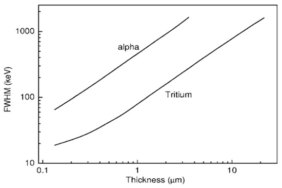 Half-height width of simulated 3H and ɑ peaks versus 6LiF conversion layer thickness [13].