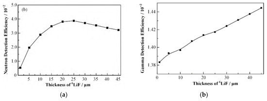 (a) Neutron detection efficiency at different 6LiF thicknesses [4]; (b) γ detection efficiency at different 6LiF thicknesses [4].