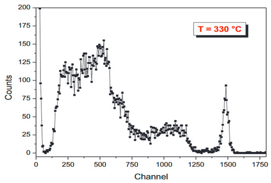 Masakatsu Tsubota’s team [21] investigated the electron transport properties of diamond detectors at high temperatures in 2015, analyzing and comparing three different types of diamond samples, and found that monocrystalline diamond has a better charge collection efficiency and stability at a temperature of 523 K, which makes it suitable for use in extreme environments. In 2016, R. Pilotti’s team carried out two studies at the Frascati Neutron Generator and the ISIS Scattered Neutron Source, respectively. The former [22] demonstrated that diamond detectors with silver contacts have good energy resolution at temperatures up to 235 °C, with a pronounced α-peak attenuation at 240 °C as shown in Figure 8. The latter [23] demonstrated that a diamond detector can be operated continuously for 100 h at high temperatures and high irradiation with a stability of up to 90%. In the same year, Muraro [24] et al. tested a matrix-type neutron detector consisting of 12 single-crystal diamond detectors on a JET and successfully reproduced the neutron energy spectrum. In 2018, Amit Kumar [25] et al. successfully demonstrated that single-crystal diamond detectors can operate at high temperatures of 300 °C. However, there are shortcomings: the detector’s encapsulation material needs to be further optimized to meet the higher temperature test requirements. In 2019, Pompili [26] et al. tested a diamond neutron detector on ITER and found no significant change in performance after two weeks of operation at 240 °C. Toyli Anniyev [27] and others in the same year carried out experimental tests on a high-purity diamond detector in the range of 25–175 °C, with a detector sensitivity area of 0.16 cm2. When the output of the pulsed neutron generator is 1.1 × 108 n/s, the count rate of the diamond detector is 620 n/s, and the detection efficiency is 0.64%, which proves the close relationship between the detection efficiency and the area of the sensitive zone.