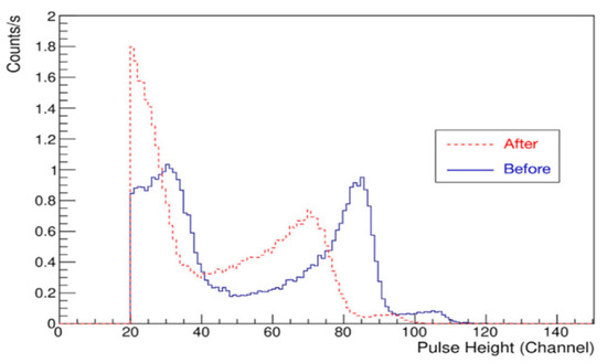 Irradiation effect. The pulse height distribution for detector in front of the thermal neutron beam before (solid line) and after (dashed line) irradiation by a 1015 n/cm2 fluence [30].