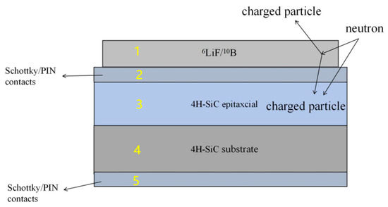 4H-SiC neutron detectors are semiconductor detectors along with diamond detectors. The universal structural design is shown in Figure 10, which consists of five parts: neutron conversion layer, Schottky or PIN front contact, epitaxial layer, substrate and Schottky or PIN rear contact. The base material for the 4H-SiC neutron detector is the broadband semiconductor silicon carbide (4H-SiC). Doping the base material with different concentrations of elements such as nitrogen or phosphorus, usually low concentration doping for the epitaxial layer and high concentration doping for the substrate. A space charge region, which constitutes the depletion layer and acts as the sensitive volume of the detector, is formed at the PN or Schottky junction and resides almost entirely within the epitaxial layer. This region is depicted in Part 3 of Figure 10. In this region, the carriers are “swept away” to form a strong built-in electric field.