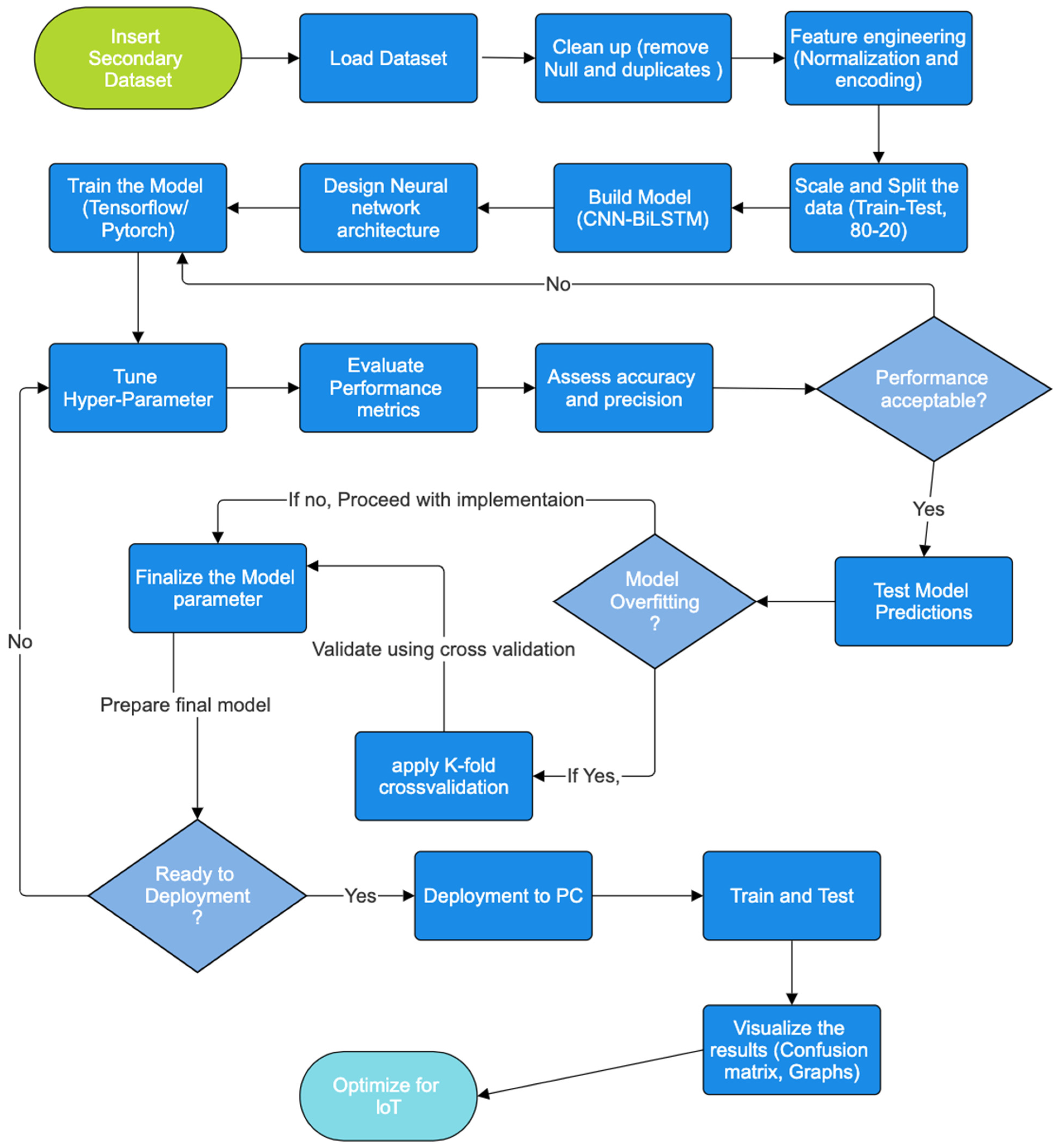 Figure 1 is a hybrid CNN-BiLSTM model designed to tackle the complex nature of IoT intrusion detection, where attacks often unfold dynamically across multiple dimensions.
