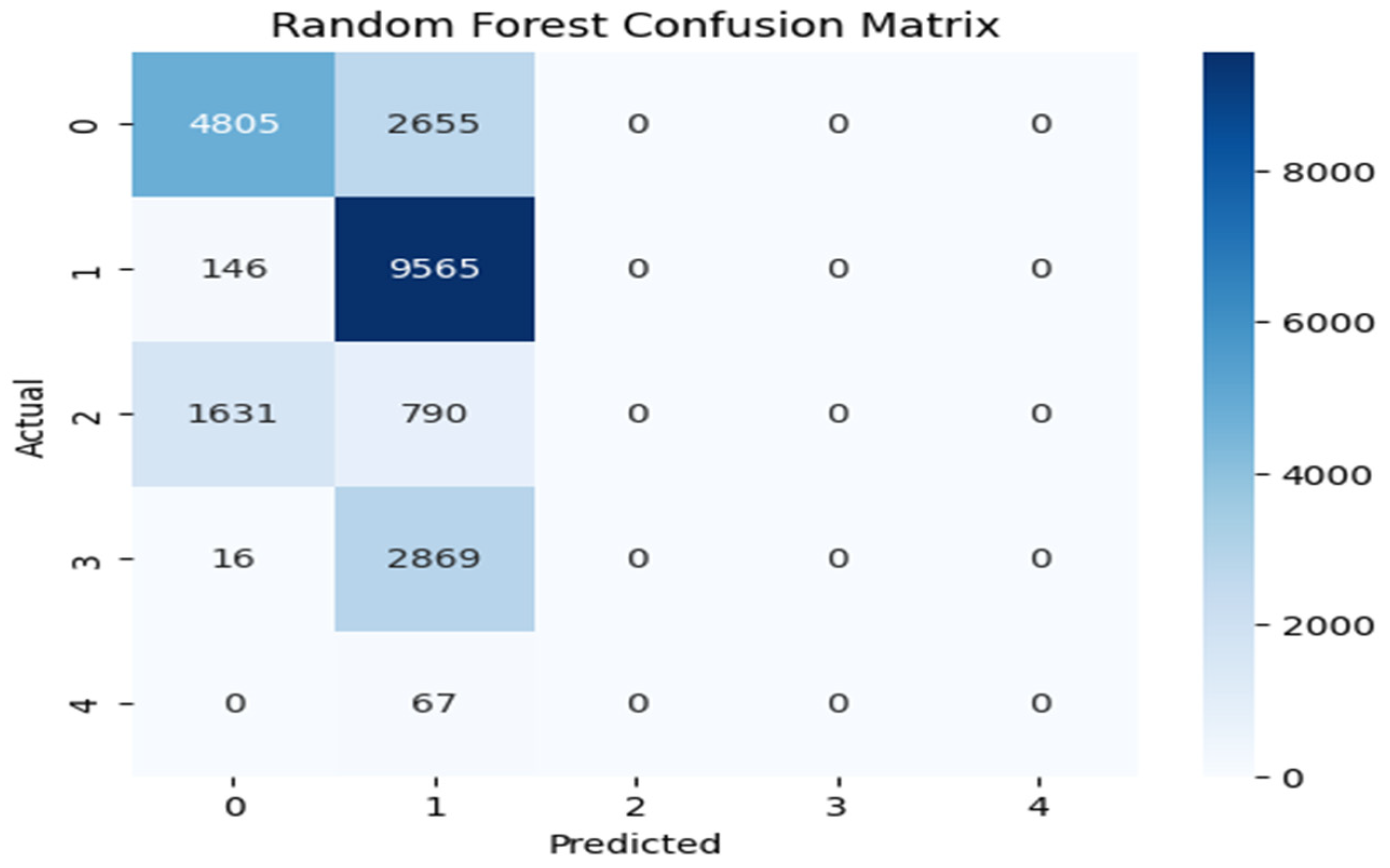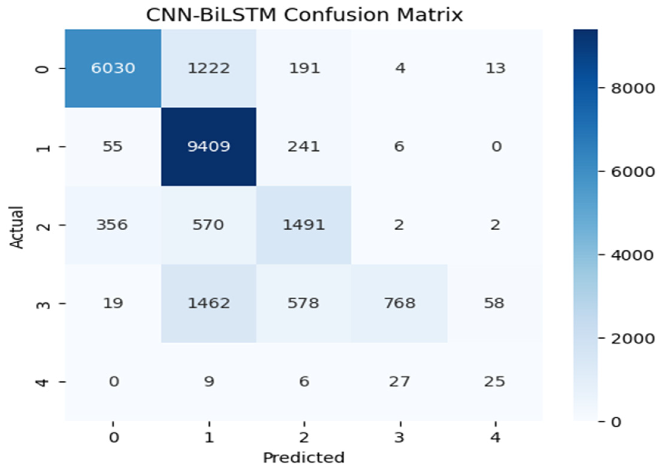 Figure 6 illustrate the model’s classification performance by contrasting predicted outcomes with actual labels. Correct classifications are shown along the diagonal of each confusion matrix, whereas the off-diagonal entries indicate incorrect classification instances, revealing patterns of inter-class confusion. The label-to-class mapping is as follows: Class 0 denotes normal traffic; Class 1 identifies Denial of Service (DoS) attacks; Class 2 captures probing activities; Class 3 corresponds to Root-to-Local (R2L) intrusions; and Class 4 represents User-to-Root (U2R) attacks. CNN-BiLSTM and XGBoost handled the majority classes (Class 0, 1, and 2) effectively, with particular showing very high recall for Class 1. However, the real challenge appeared in the minority classes. CNN-BiLSTM often misclassified Classes 3 and 4 into the larger categories, though it managed to identify a few Class 4 cases and XGBoost showed a similar pattern, where Random Forest failed entirely. Random Forest’s confusion matrix was the most concerning, as it was heavily skewed towards Class 1 and showed almost no recognition of Classes 2, 3, and 4.