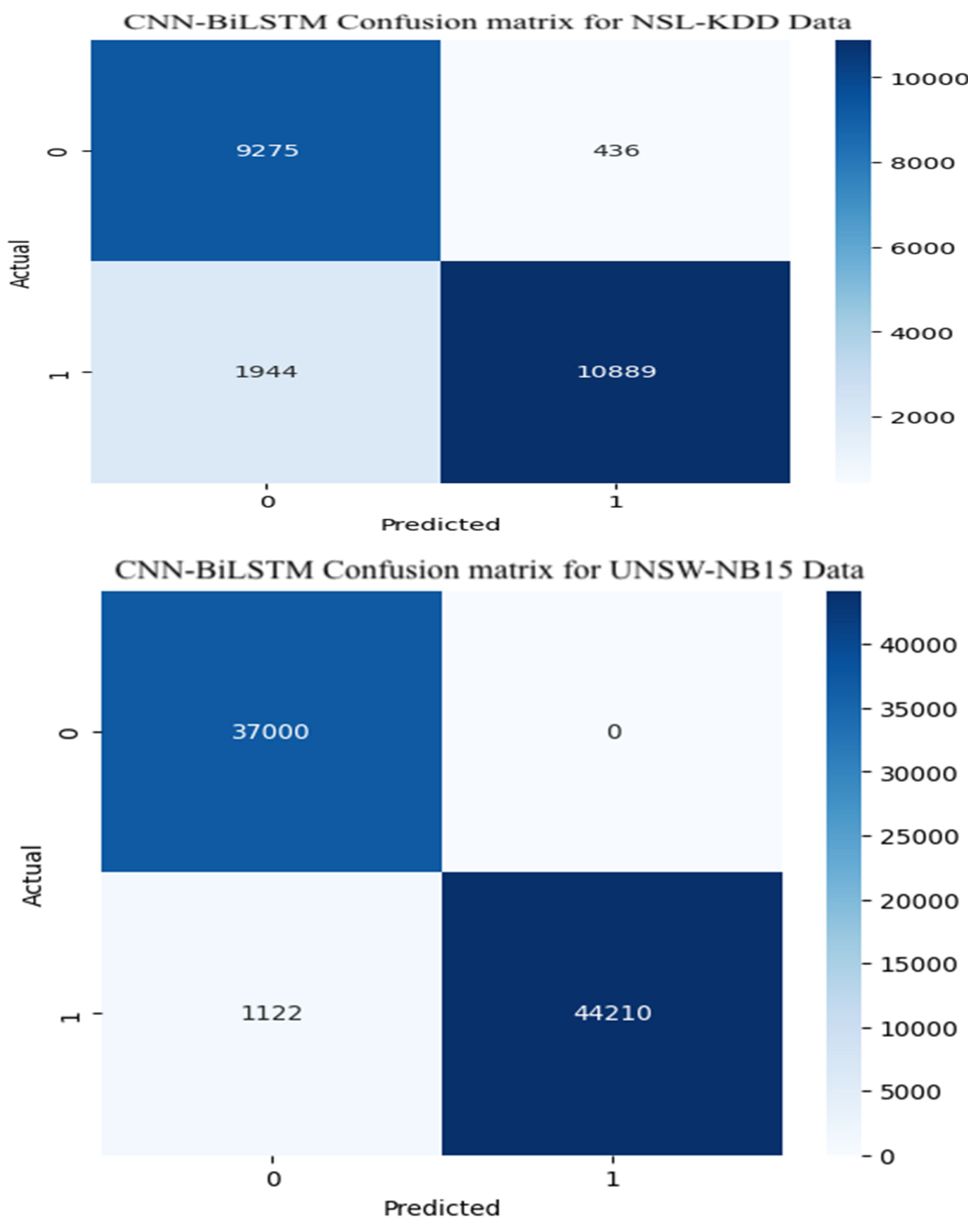 Figure 7 displays the confusion matrix corresponding to the CNN-BiLSTM model applied across both the NSL-KDD and UNSW-NB15 datasets. In this context, Class 0 represents normal traffic, while Class 1 denotes attack instances. For the NSL-KDD dataset, the model successfully identified 9275 normal instances and 10,889 attack instances, resulting in an overall accuracy near 89% and a precision rate of around 90%. Performance on the UNSW-NB15 dataset was stronger. The model correctly classified all 37,000 normal traffic instances and misclassified only 1122 out of 46,000 attack samples. This corresponds to an accuracy and precision of approximately 98%, demonstrating the resilience and generalization strength of the model across heterogeneous attack scenarios.