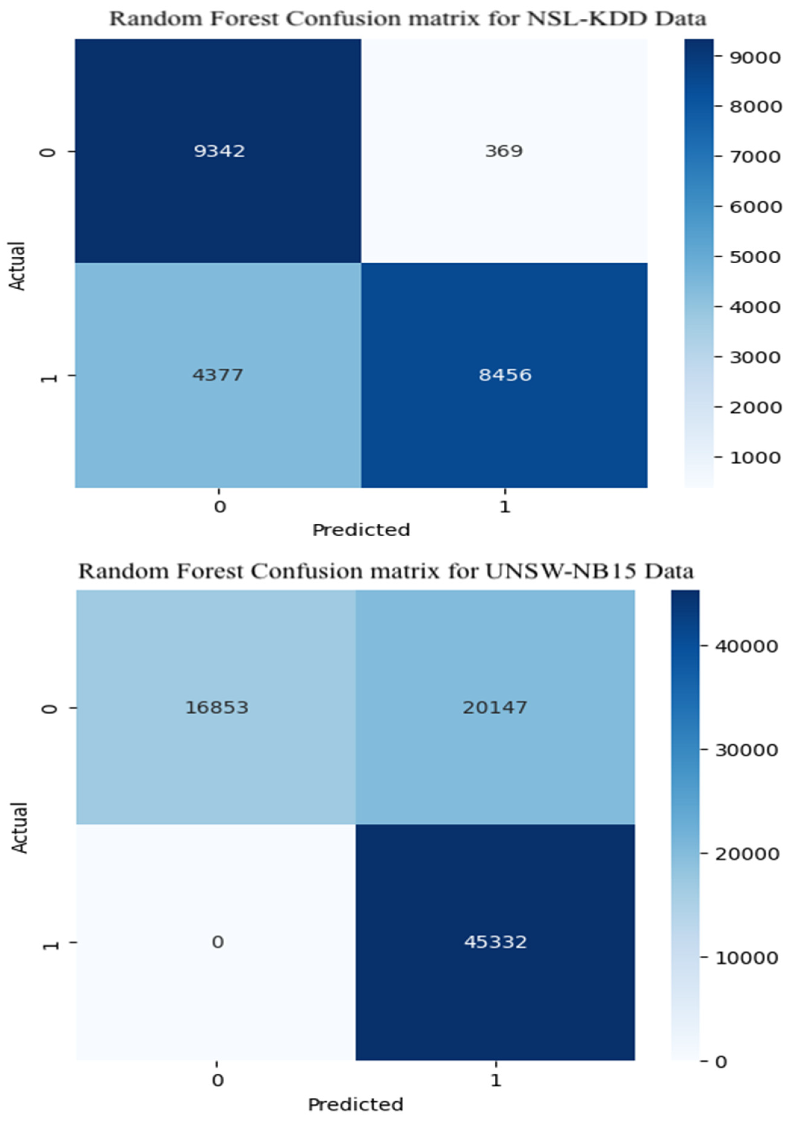 The Random Forest model was evaluated on both the NSL-KDD and UNSW-NB15 datasets for multiclass and binary attack detection tasks. As shown in