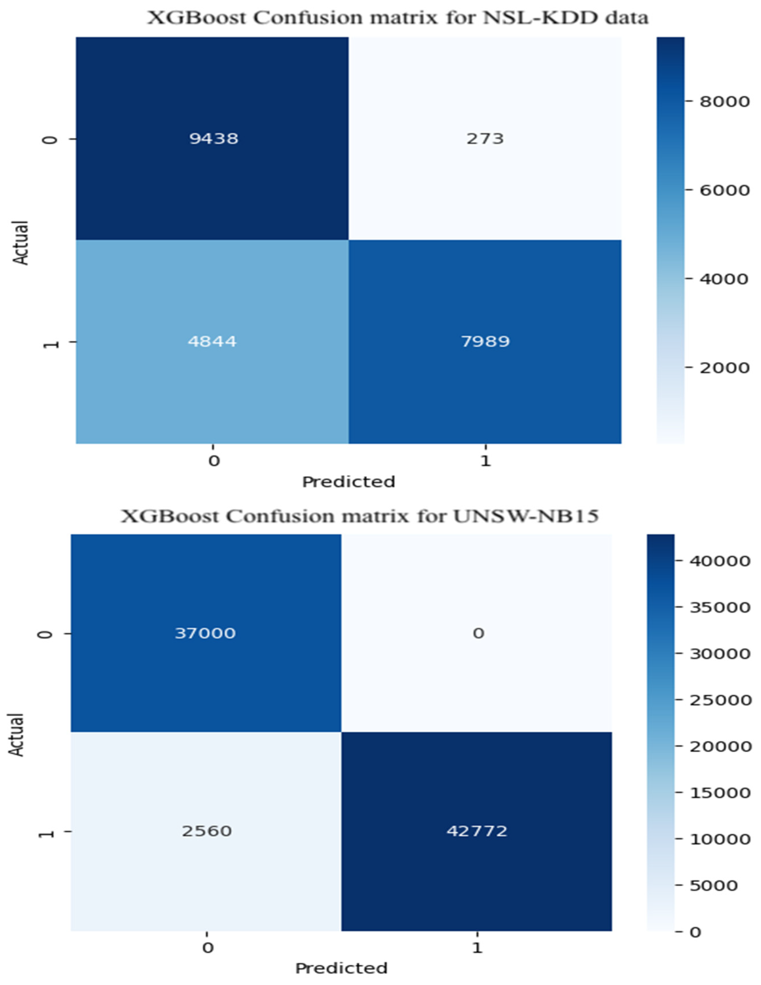 Figure 9 presents the confusion matrix for the XGBoost model under binary classification of attack instances. Findings indicate that the model achieves satisfactory performance on Class 0 (normal traffic) in the NSL-KDD dataset, with relatively few misclassifications outperforming both Random Forest and CNN-BiLSTM in this category. However, its performance on Class 1 (attack traffic) is less effective, with the lowest correct prediction rate among the three models. A similar trend is observed with the UNSW-NB15 dataset: while the model excels in identifying normal traffic, it struggles to accurately classify attack instances, indicating limitations in its generalization across diverse intrusion patterns.