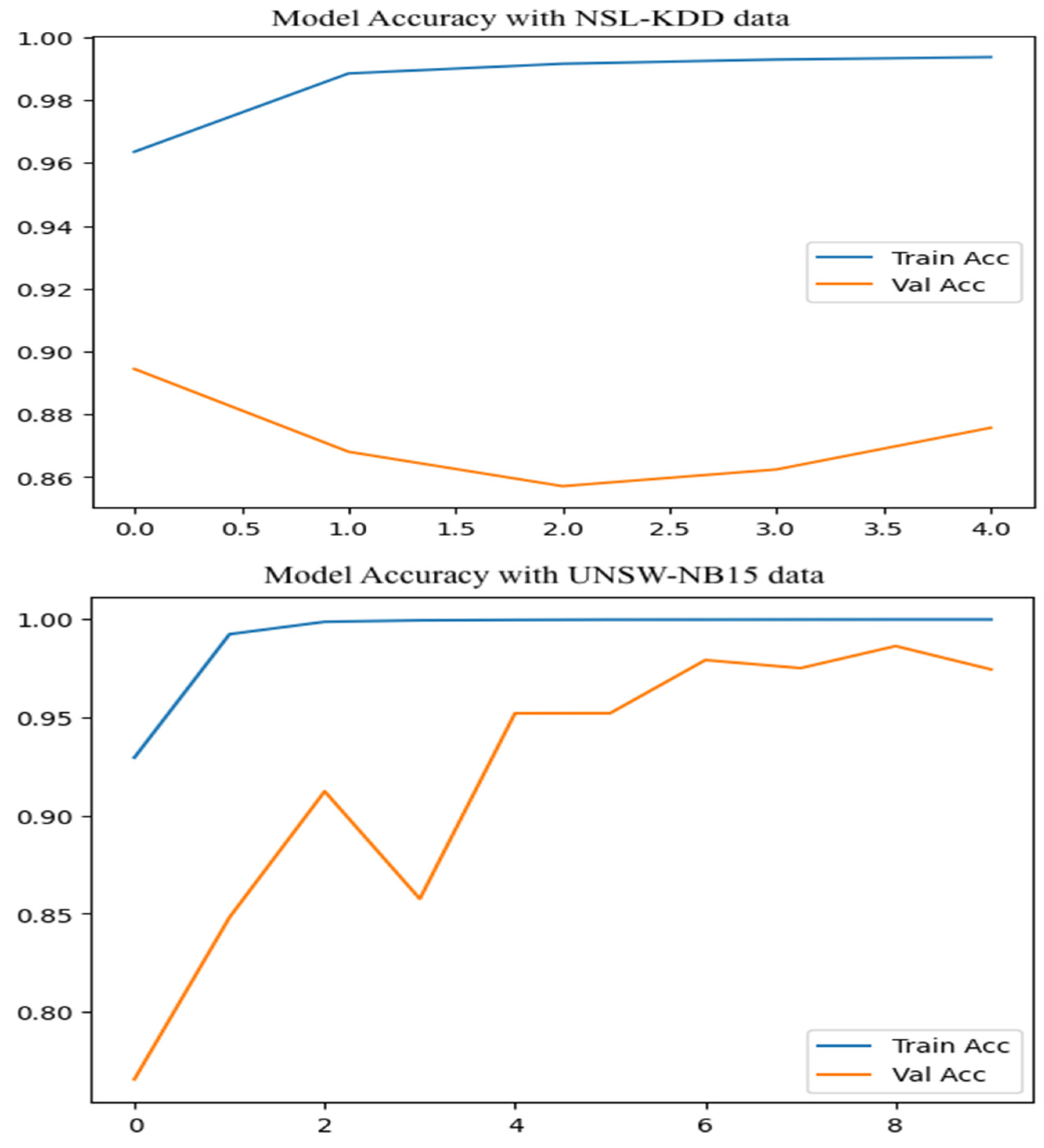Figure 10 illustrates a rapid rise in training accuracy (Train_Acc) with multiclass attack NSL-KDD, which remains consistently high across all epochs signifying effective learning from the training data. In contrast, validation accuracy (Val_Acc) starts around 0.82 but fluctuates between 0.76 and 0.81 throughout the training process. This persistent gap between training and validation performance highlights a generalization issue: while the model performs reliably on known data, its ability to handle unseen inputs is less stable. The observed variability in validation accuracy implies that certain attack categories may not be consistently detected across epochs.