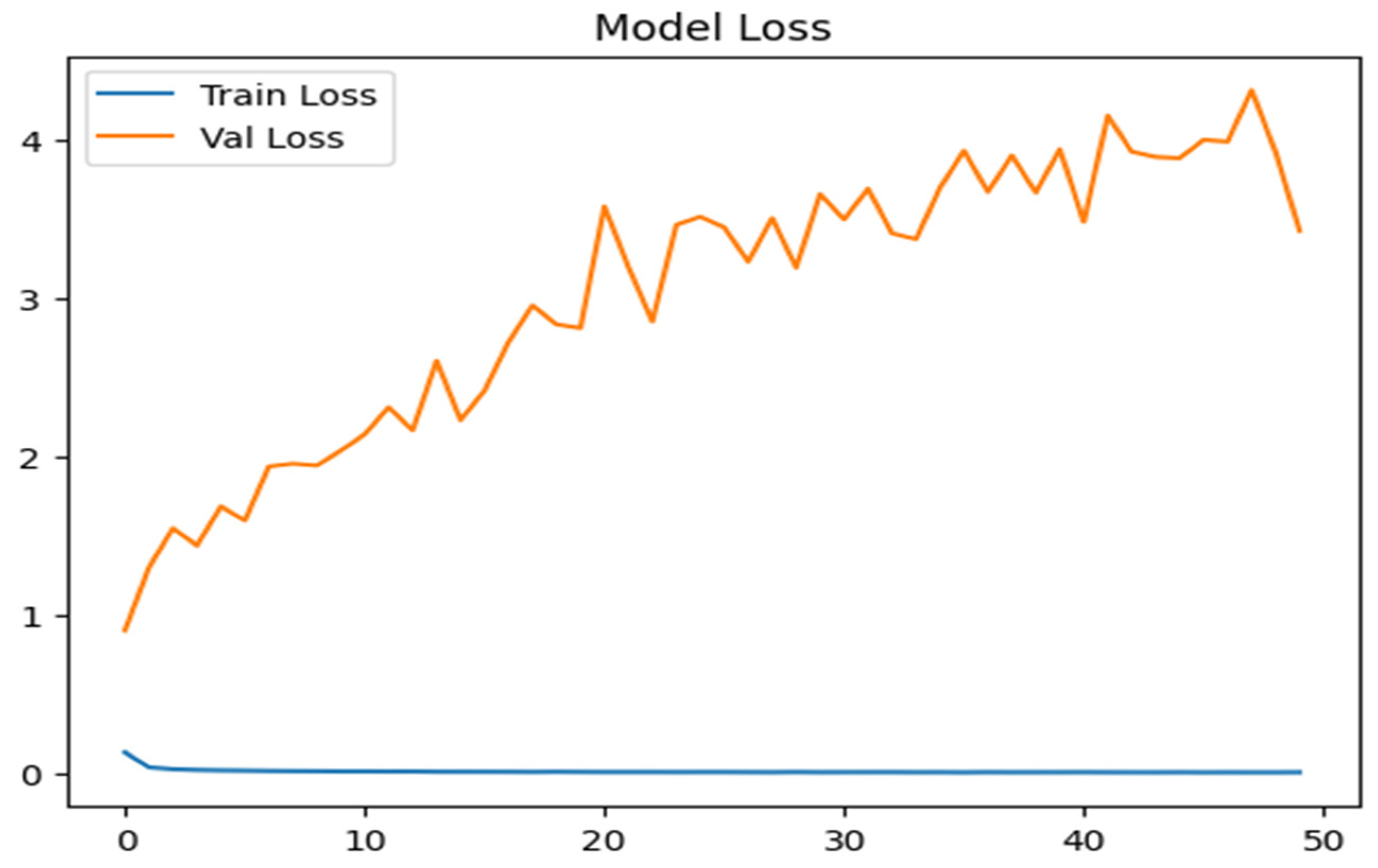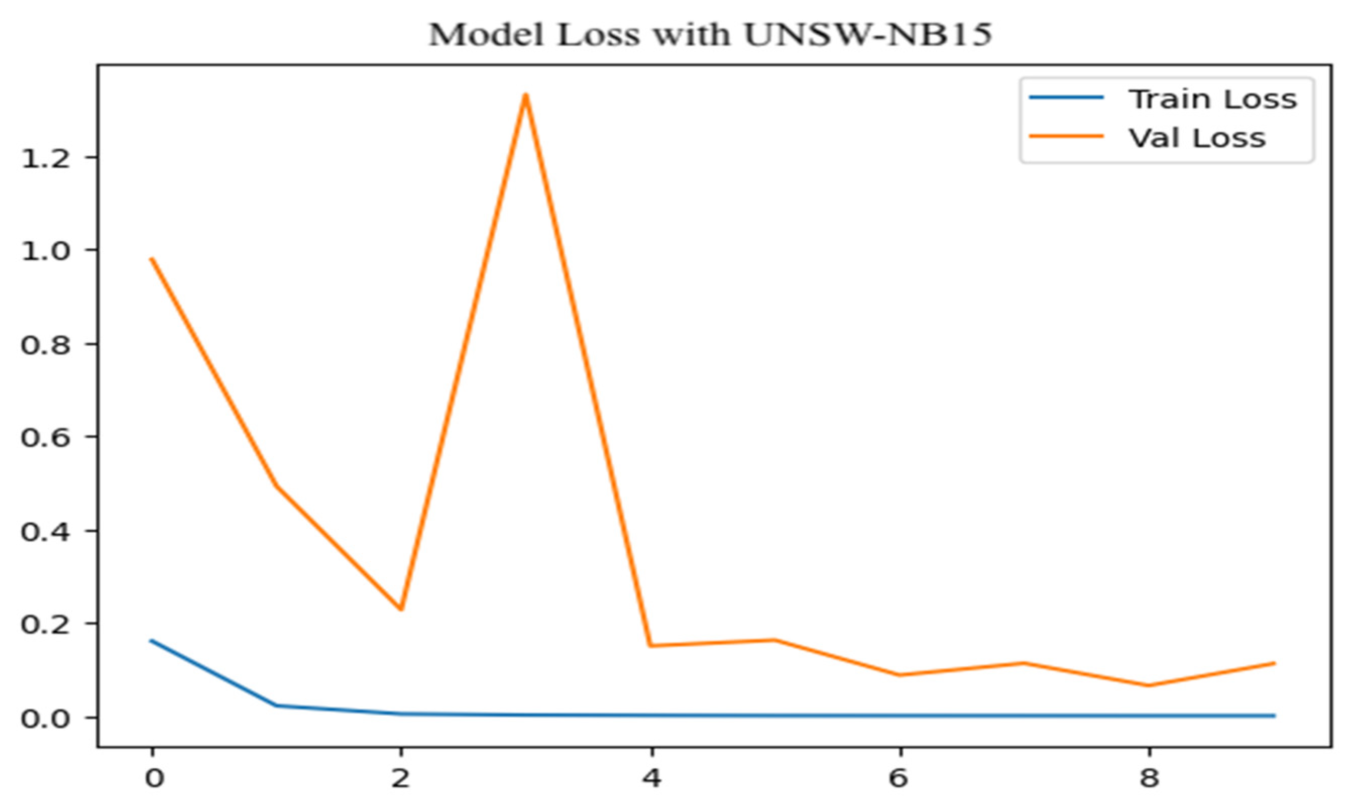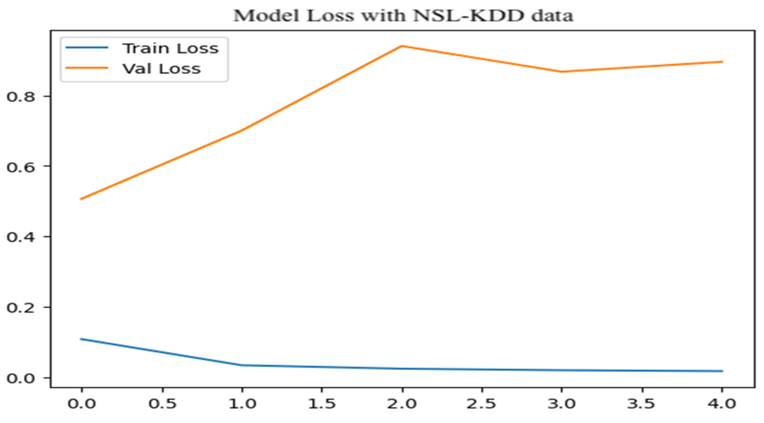 Figure 12, the training loss begins at approximately 0.15 and quickly drops to near zero, indicating minimal error and strong convergence during multiclass classification on the NSL-KDD training set. In contrast, the validation loss starts around 1.0 and steadily increases, peaking near 5.0 with noticeable fluctuations. This widening gap between training and validation losses suggests noticeable overfitting, where the model becomes tailored to training data yet fails to generalize well to new samples.