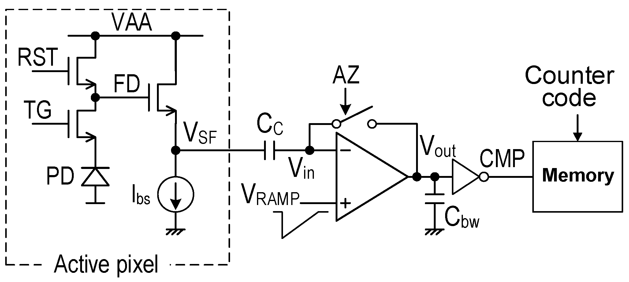 - Limiting the noise bandwidth for low random noise is less effective if the main contributor to noise performance in digital-pixel sensors is flicker noise of the comparator’s input transistor.