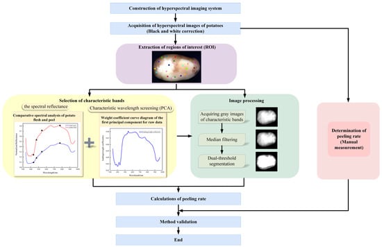 This study utilized a hyperspectral imaging system to acquire spectral images of potatoes following waterjet peeling. Spectral images were subjected to black and white correction, and regions of interest (ROIs) were selected to extract spectral information. Key feature bands were identified based on spectral curves and principal component analysis. Median filtering was applied to the grayscale images of these key bands, followed by dual-threshold segmentation to separate potato flesh and peel. The peeling rate was calculated as the pixel ratio between segmented potato flesh regions and potato regions. The flow is shown in Figure 1.