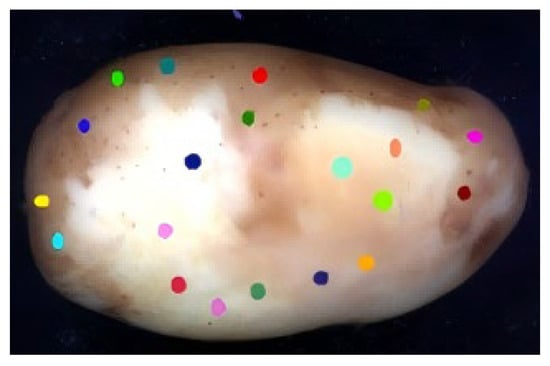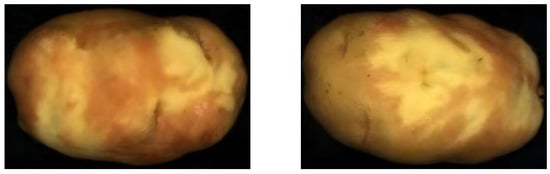 One hundred ‘Helan15’ potatoes were selected as test samples. All samples were measured three times with a vernier caliper, and the average values were recorded. The long axis of the samples was 93.6 mm and the short axis was 59.9 mm. Before image collection, all potatoes were peeled using the waterjet peeling machine (Guangzhou Linjun Mechanical & Electrical Equipment Co., Ltd., Guangzhou, China) and allowed to stand for 30 min under a ventilated indoor environment at 25 °C.