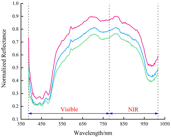This study focused on two regions of interest: potato peel and flesh. Following spectral extraction and black-and-white correction, reflectivity data were plotted in the same figure. Representative reflectance curves from multiple regions of interest (ROIs) for potato flesh and peel are presented in Figure 4 and Figure 5, respectively. Each figure displays three selected curves that illustrate the characteristic spectral trend and the natural range of reflectance variation within each category.