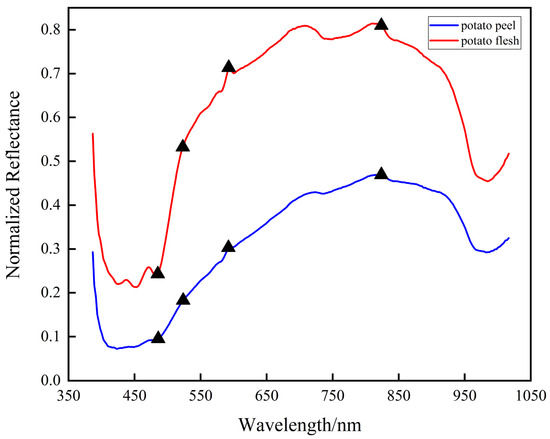 To more clearly demonstrate the spectral reflectance differences between potato flesh and peel, we averaged spectral data sets for each category and plotted the results in Figure 6.