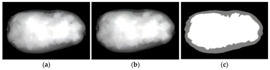 Grayscale images of peeled potatoes in the 592 ± 20 nm wavelength band were processed using a Python program (version 3.10.16). A 5 × 5 median filter was applied to these images, with two thresholds set to differentiate among the potato peel, potato flesh, and background: Tlow = 35, Thigh = 125. By adjusting and narrowing threshold ranges, we observed the segmentation effect of potato peel, potato flesh, and background. We found that setting Tlow at 35 and Thigh at 125 effectively separated the peel and flesh regions. Figure 8 reveals the effect after median filtering and dual-threshold segmentation.
