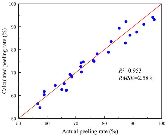 Thirty potato samples were randomly selected for the experiment. Following median filtering and dual-threshold segmentation, potato peeling rate was calculated according to the above Equation (8). Figure 9 presents the calculation results of peeling rates for different potato samples, including the calculated peeling rates, the actual peeling rates determining through manual measurement.