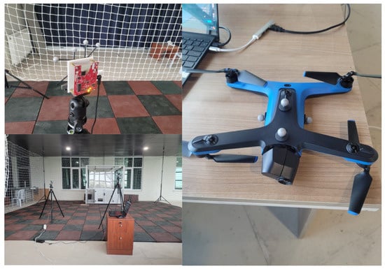 The indoor laboratory was arranged to minimize occlusions and ensure stable lighting. The flight volume was enclosed with a safety net for operational safety. This controlled setup enabled synchronized and reliable data collection from all three systems—radar, camera, and OptiTrack. An overview of the sensor placement, experimental environment, and the Skydio 2 drone are shown in Figure 1.