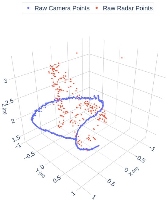Once the radar and camera trajectories were temporally synchronized, the goal was to estimate the rigid-body transformation , the Special Euclidean group of 3D rigid motions, which represents all rotations and translations in three-dimensional space. This transformation maps 3D points from the radar coordinate frame to the camera frame. This transformation consists of a 3 × 3 rotation matrix and a 3 × 1 translation vector , such that for any radar measurement , its corresponding point in the camera frame is approximated by: