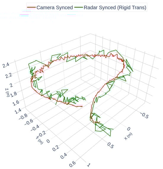 It is important to emphasize that temporal synchronization and spatial calibration are two separate steps: the former aligns the radar and camera measurements in time, while the latter estimates the rigid transform between their coordinate frames. The trajectories in Figure 4 represent the result after both steps, whereas Figure 5 is a smoothed visualization of the same aligned data.