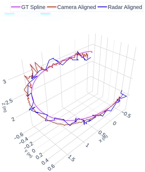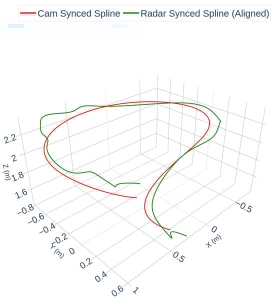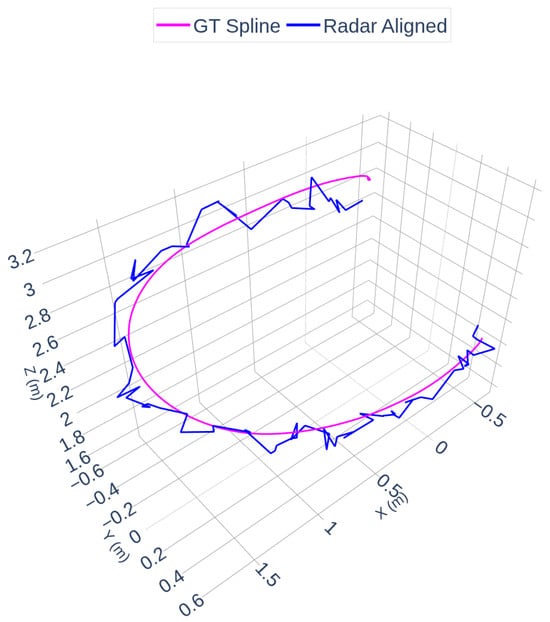 The accuracy of the spatial alignment was quantified using Root Mean Square Error (RMSE) computed between the spline-interpolated radar trajectory and the ground truth spline. The RMSE after spline timestamp interpolation alignment was 0.1171 m, indicating decimeter-level spatial agreement (approximately 12 cm RMSE) in the aggregate path reconstruction. Additionally, the radar spline timestamp interpolation RMSE was measured as 0.1697 m, reflecting the sparser nature of the radar point cloud.