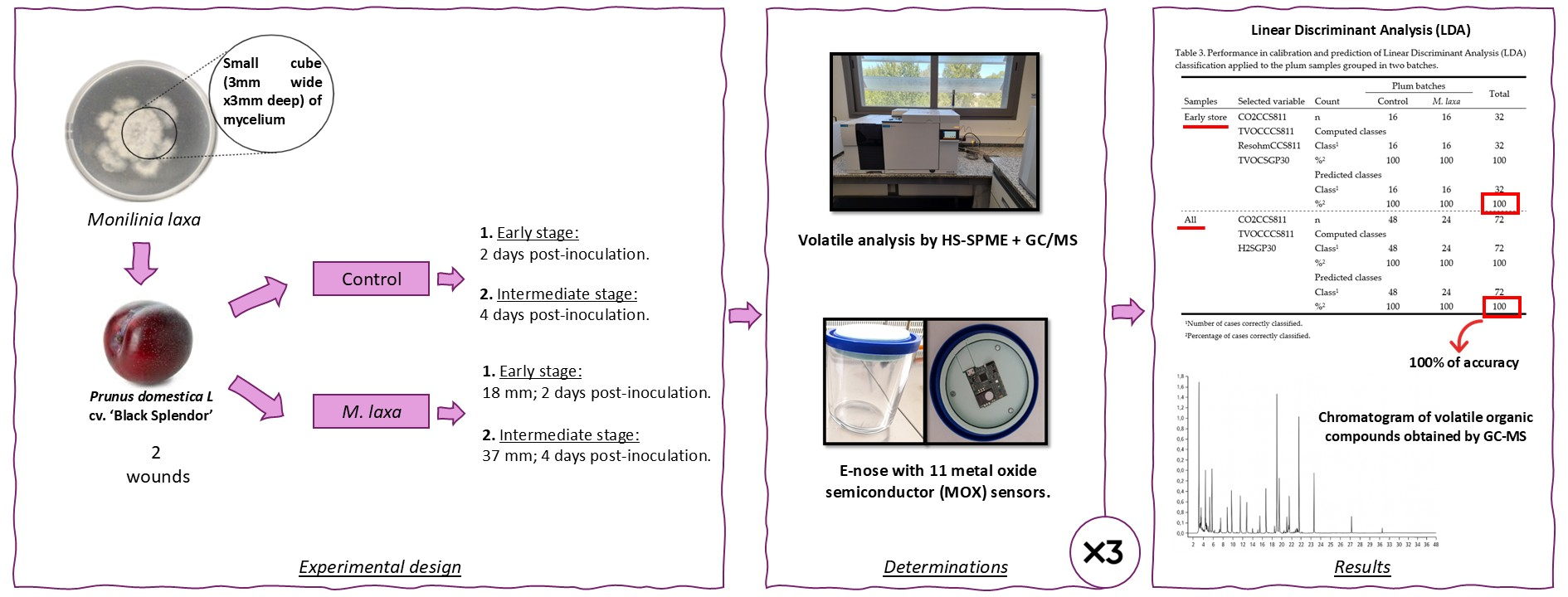 - This study analyses the use of electronic nose (E-nose) technology for the early detection of Monilinia laxa contamination in red-fleshed plums (cv. Black Splendor) during storage.