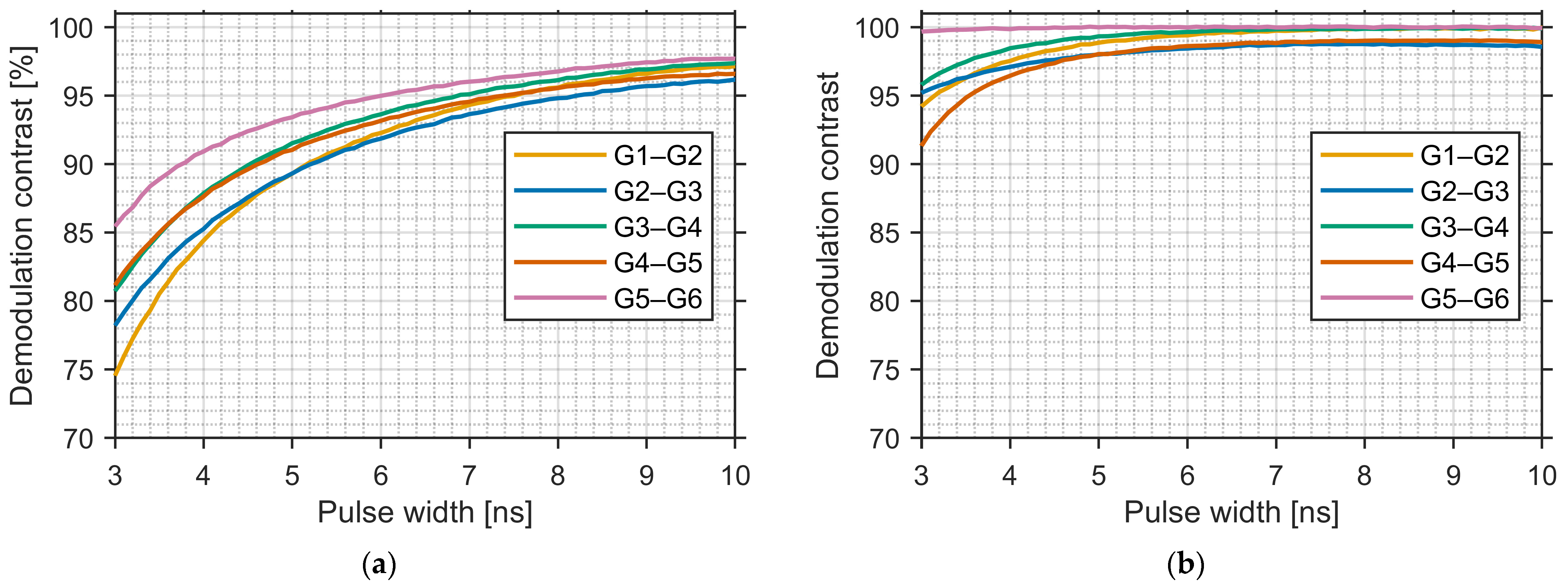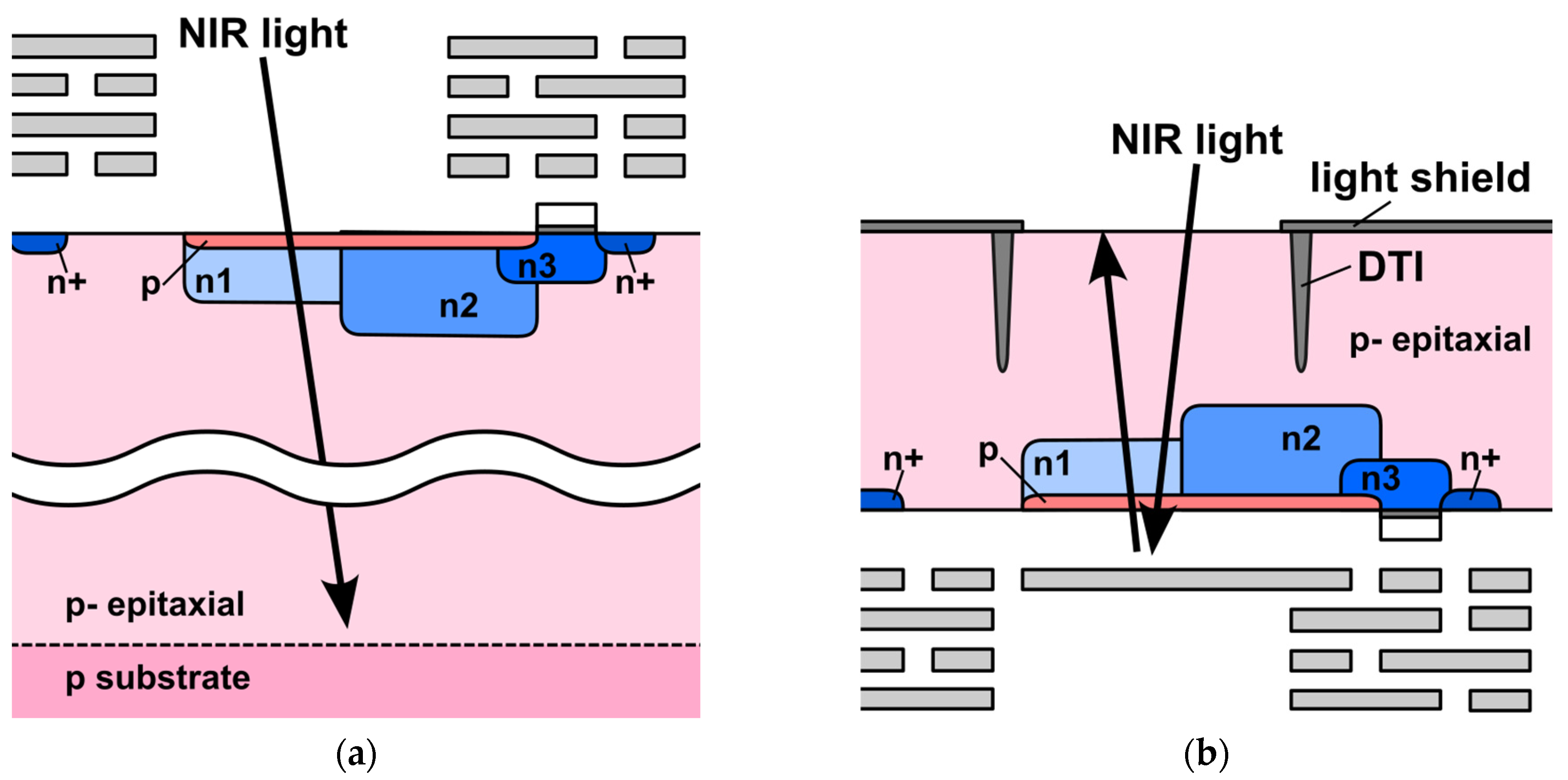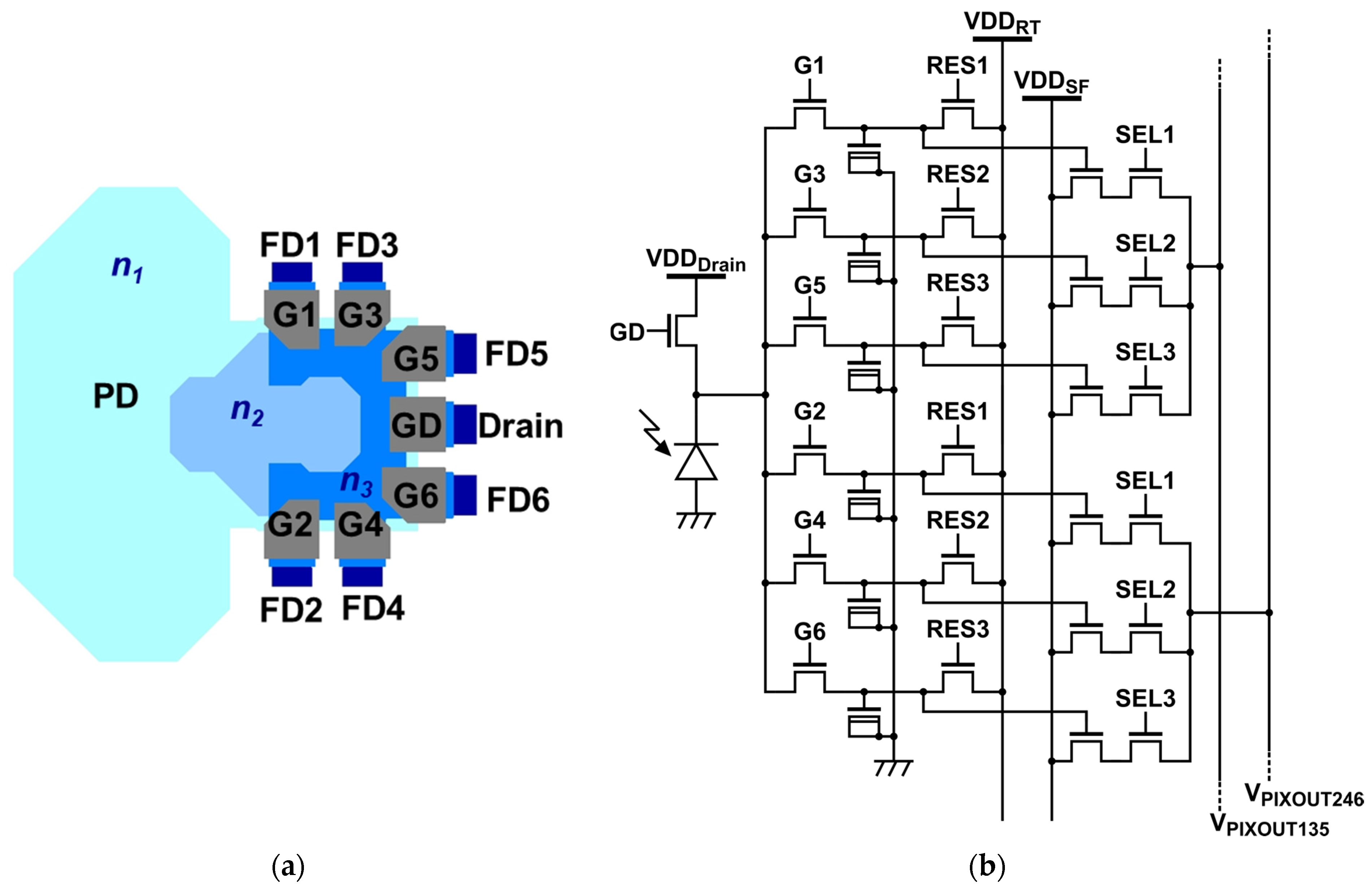 - Acerbi, F.; Moreno-Garcia, M.; Köklü, G.; Gancarz, R.M.; Büttgen, B.; Biber, A.; Furrer, D.; Stoppa, D. Optimization of pinned photodiode pixels for high-speed time-of-flight applications. IEEE J. Electron Devices Soc. 2018, 6, 365–375. [Google Scholar] [CrossRef]