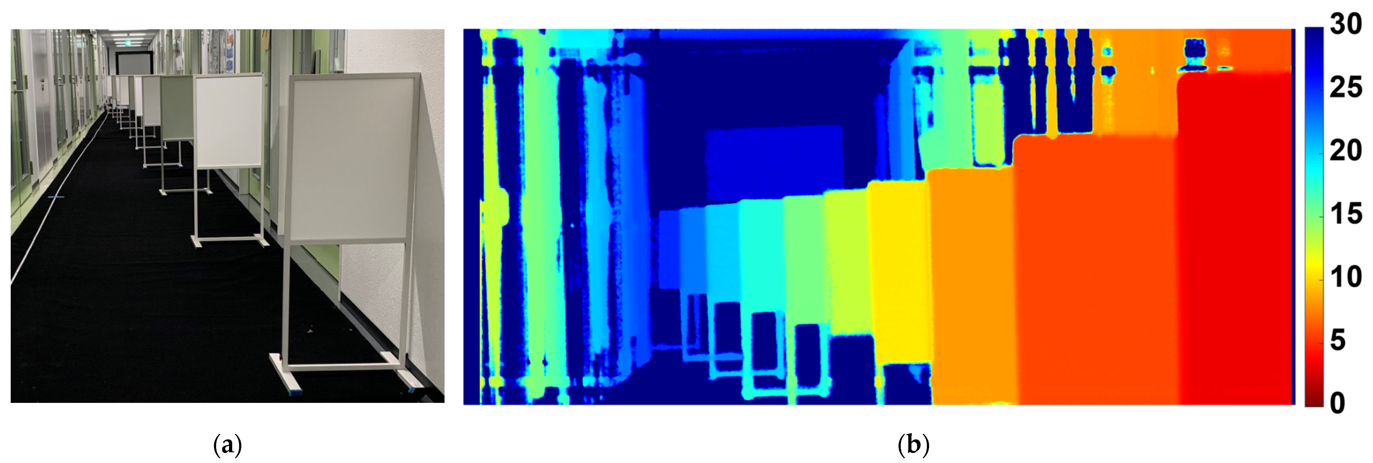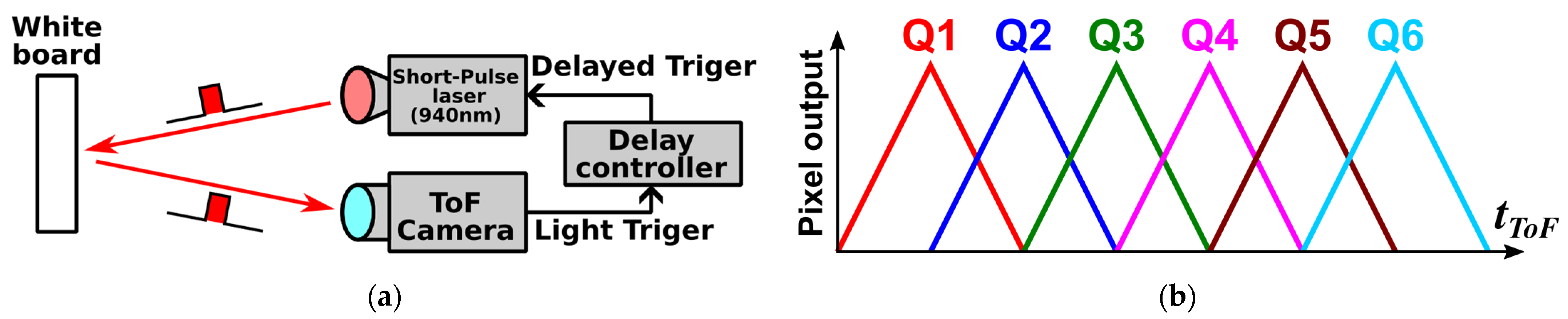 - Spickermann, A.; Durini, D.; Suss, A.; Ulfig, W.; Brockherde, W.; Hosticka, B.J.; Schwope, S.; Grabmaier, A. CMOS 3D image sensor based on pulse modulated time-of-flight principle and intrinsic lateral drift-field photodiode pixels. In Proceedings of the ESSCIRC 2011—European Solid-State Circuits Conference (ESSCIRC), Helsinki, Finland, 12–16 September 2011; pp. 111–114. [Google Scholar] [CrossRef]