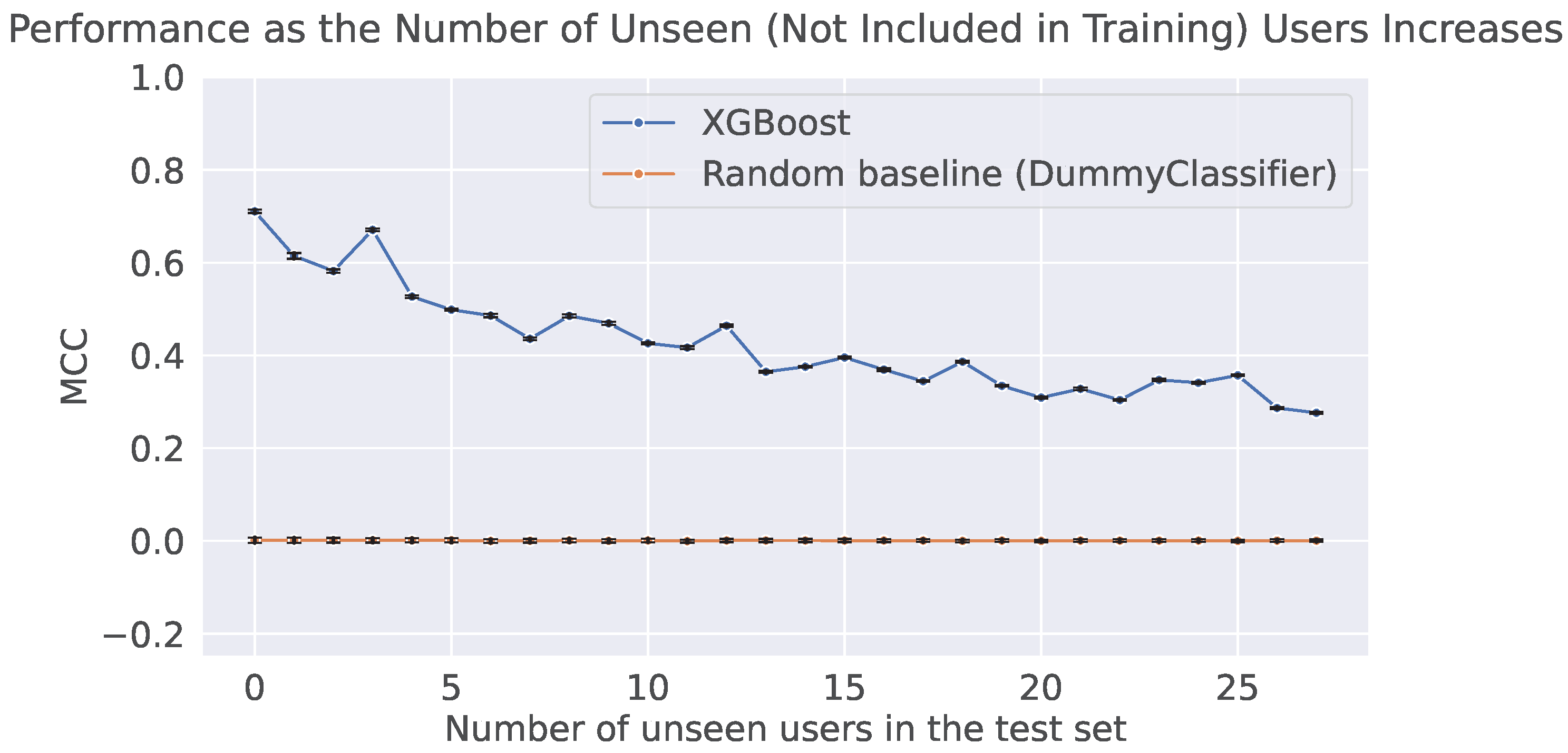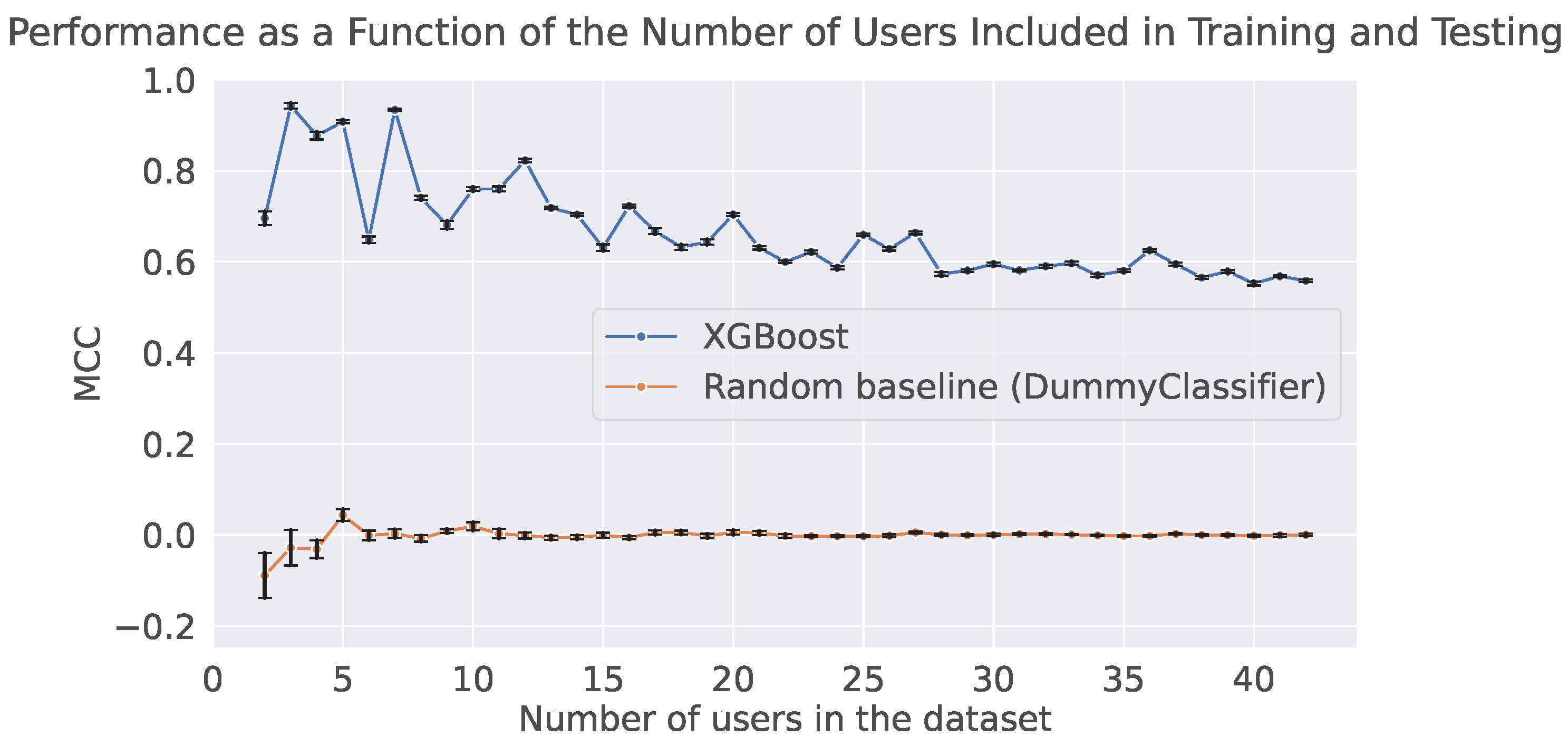 27] and introduce a feature-based approach that incorporates both time- and frequency-domain characteristics as a baseline. We then assess the impact of dataset size, real-world variability, unseen users, and temporal separation on biometric performance.