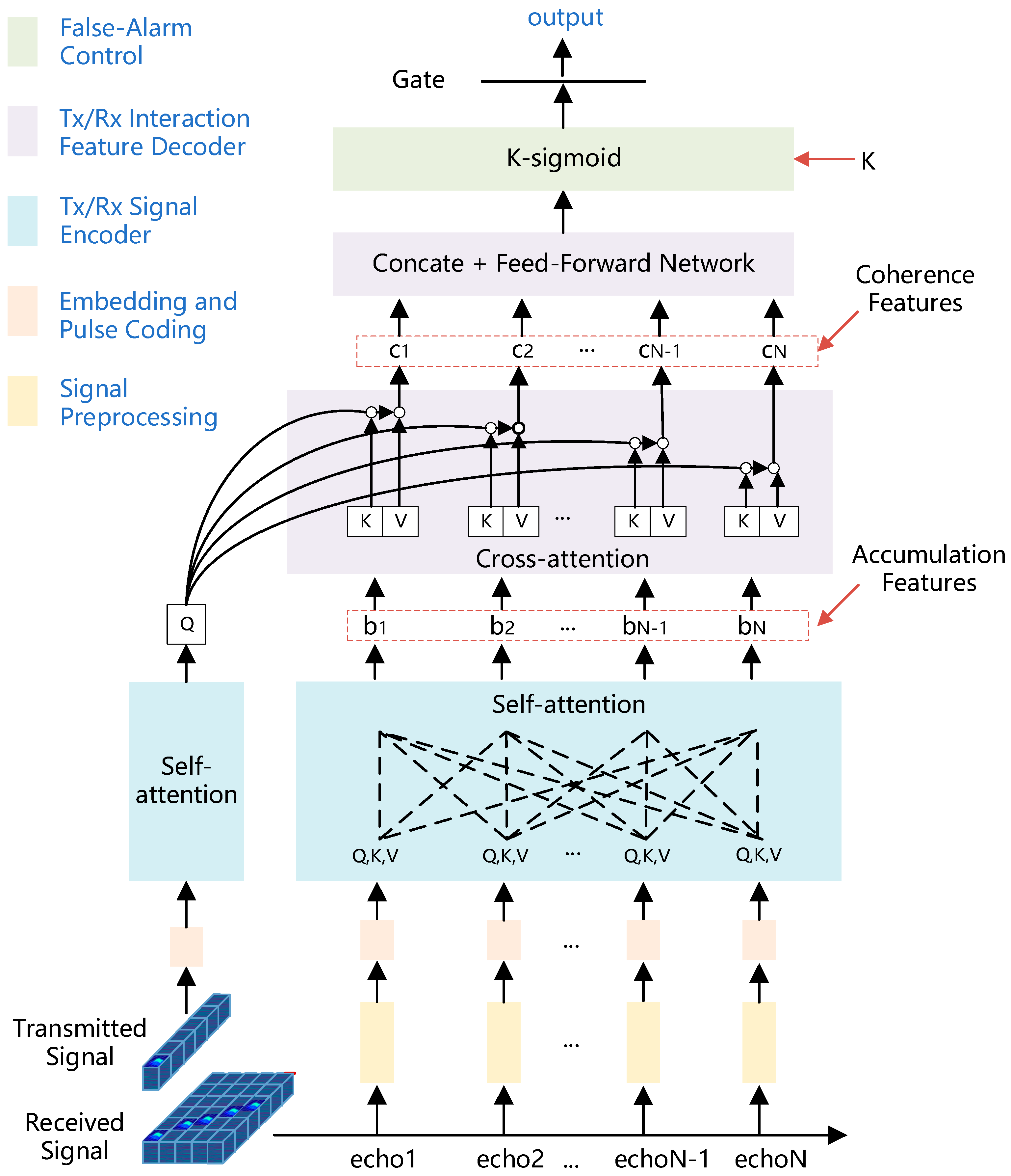 16] combine Transformer and CNN modules to achieve target detection. However, these designs have demonstrated almost exclusively on Frequency Modulated Continuous Wave Radar, and comparable approaches for coherent accumulation in pulse-radar systems remain unexplored. Moreover, the CNN-based dimension-mapping required to fuse two elaborate models incurs a substantial computational overhead, and the use of fixed false alarm control during training precludes flexible adjustment of the false alarm level during inference.