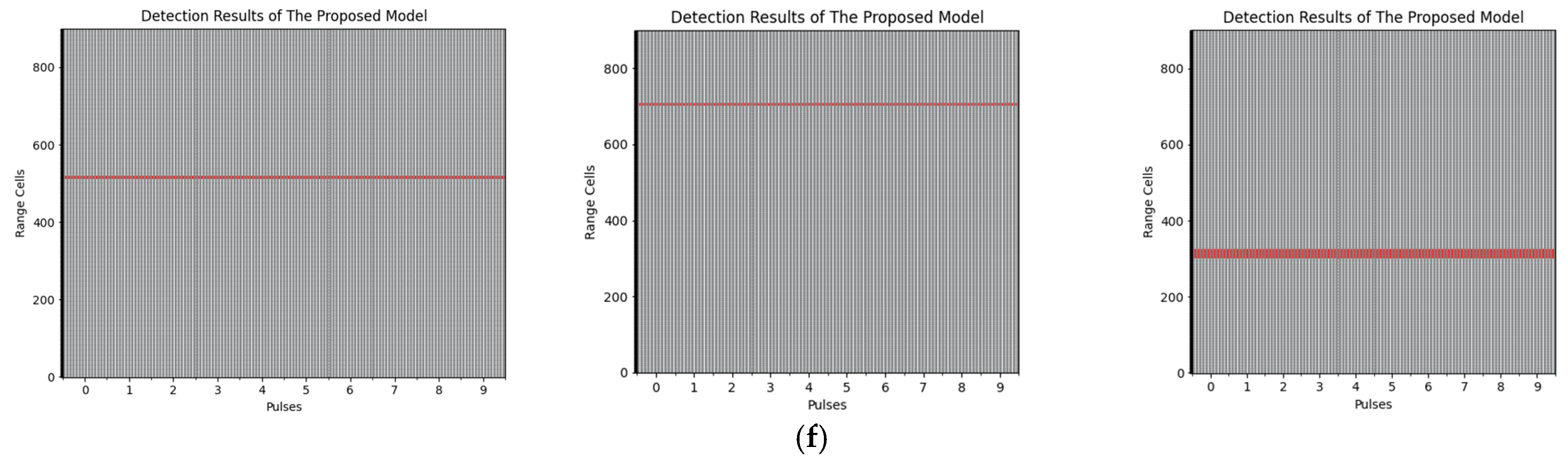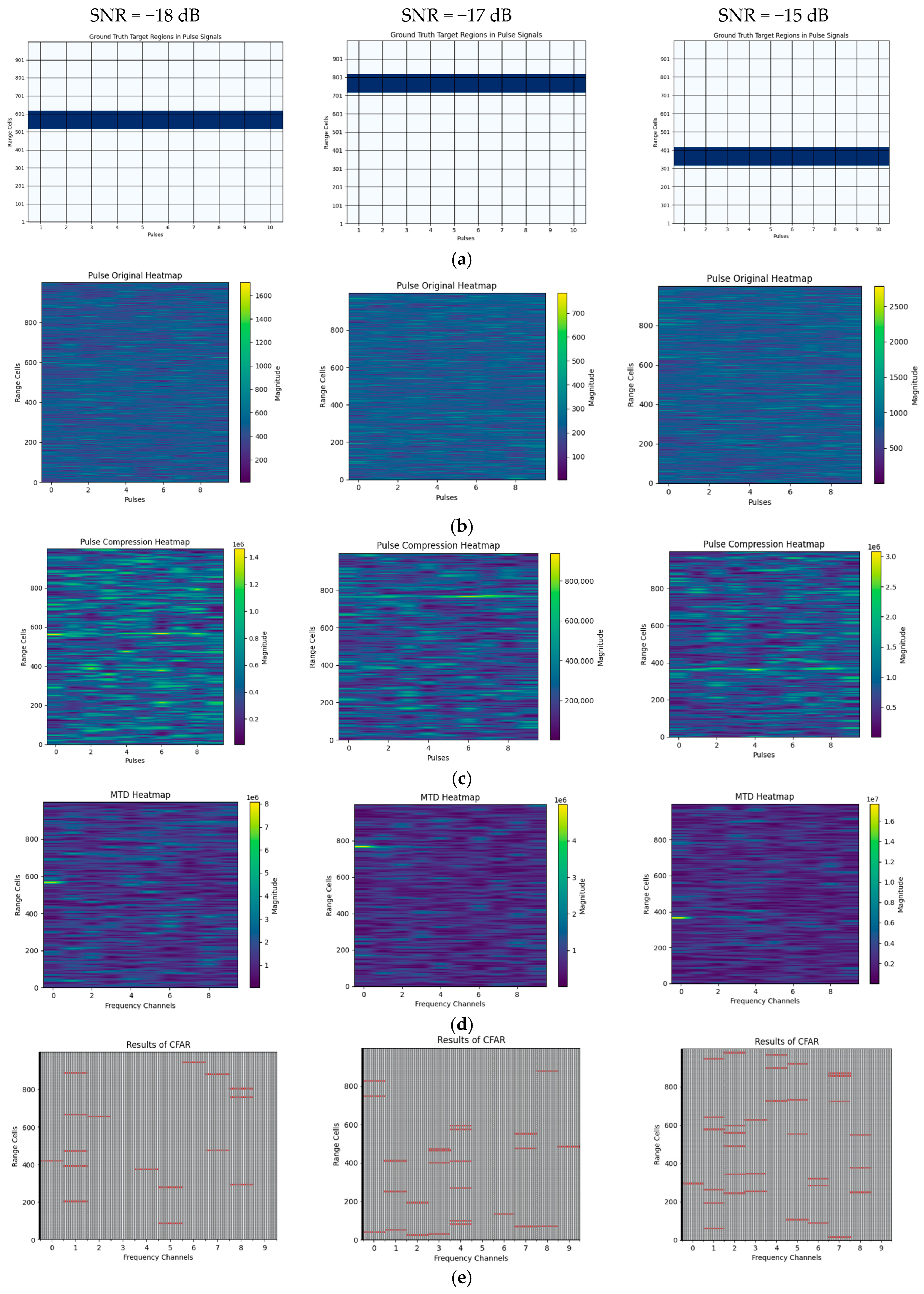Figure 4. For 10-pulse coherent accumulated echo sequences with SNR of −18 dB, −17 dB, and −15 dB, the proposed model successfully detects the target while maintaining control over false alarms. In contrast, conventional radar optimal energy detection methods, such as optimal pulse compression, range-Doppler coherent accumulation, and constant false alarm rate (CFAR) detection, struggle under these conditions. The extremely weak target echo signals result in inconspicuous target features across various conventional transform domains, leading to either excessive false alarms or an inability to detect any targets. In the conventional processing pipeline used for comparison, the complex I/Q echoes within each CPI are first matched-filtered using the known transmit waveform. The resulting outputs are then coherently integrated over N pulses in the range-Doppler domain based on the true PRI. Finally, detection is performed using a cell-averaging CFAR detector.