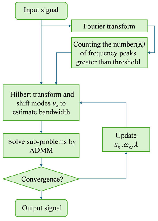 VMD separates the input signal f(t) into intrinsic mode functions (IMF) uk with different center frequencies, thereby achieving signal and noise separation. The VMD constraint problem can be characterized as follow [16].
