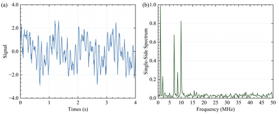 In the simulations and experiments conducted for this study, the parameters for VMD were configured as follows: penalty factor = 2000, absolute noise tolerance = 10−9, and default number of modes = 5. The adaptive VMD process is detailed in this section, with a five-frequency unequal amplitude sinusoidal noisy signal serving as an illustrative example. The mathematical representation of the simulated signal is provided below.