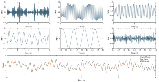 Adhering to the widely recognized “1/10 rule,” the procedure involves incrementing the count value by 1 whenever a frequency peak with a power exceeding 1/10 of the maximum power is detected. This iterative process continues until all spectral components have been thoroughly examined, with the final count value determining the number of modes for VMD modal decomposition. The time-domain and frequency-domain representations of the signal are visually depicted in Figure 2. The frequency domain clearly reveals the presence of five distinct frequency peaks. Subsequently, the signal is decomposed into five modes, and the individual order IMFs, along with the synthesized signal, are illustrated in Figure 3. An initial estimation of the effective modes can be made based on the energy proportion of each mode.