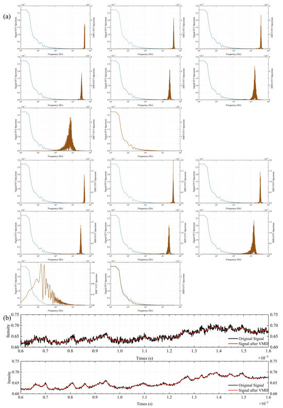 (a) The overlapping situation of the spectra of each IMF; (b) Comparison before and after VMD denoising.