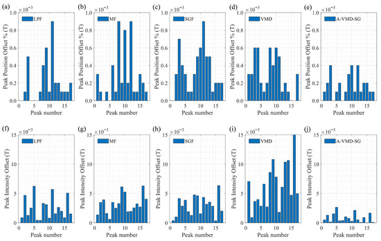 The Peak Position Offset and Peak Intensity Offset of different algorithms are calculated at an SNR of 50 dB. The A-VMD-SG algorithm demonstrates significantly better performance than other algorithms, with a peak position offset of less than four parts per million of the sampling length and a peak intensity offset of less than three parts per thousand, as detailed in Figure 15.