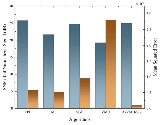 To evaluate the signal reconstruction effect, the mean square error (MSE) is used for assessment. The data is shown in Figure 16. Even though the SNR of other algorithms is close to that of A-VMD-SG, their reconstruction errors are much worse, indicating that A-VMD-SG can also perform well in the spectral transition region for smoothing.