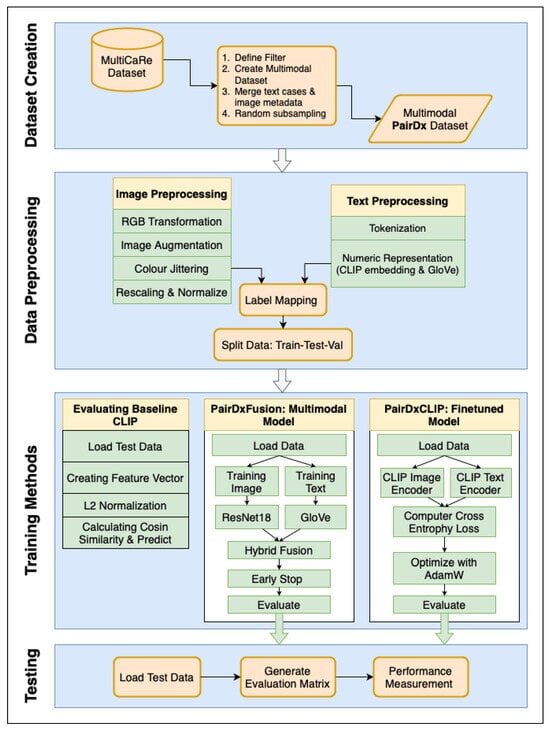 A standardized preprocessing pipeline was established to prepare both the image and text data for model ingestion. For images, the PairDxFusion model employed a comprehensive augmentation strategy: all images were first converted to RGB and then subjected to multiple augmentation techniques, including RandomHorizontalFlip (to randomly flip images horizontally and increase variability), RandomRotation (to simulate a range of plausible orientations), and ColorJitter (to vary brightness, contrast, saturation, and hue, thereby enhancing diversity in color presentation). Images were subsequently normalized using the standard ImageNet mean and standard deviation, ensuring compatibility with the pre-trained ResNet backbone [44]. For CLIP-based models, image inputs were processed using the official CLIP ViT-B/32 preprocessing pipeline developed by OpenAI (San Francisco, CA, U.S) to maintain consistency with the model’s original training.