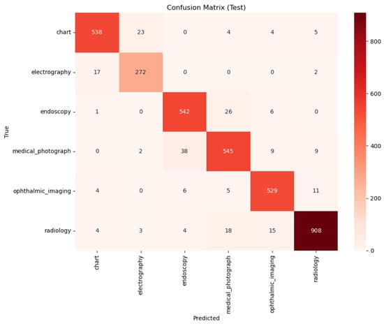 A qualitative comparison of the models’ error patterns using the test set confusion matrices (Figure 8 and Figure 9) reveals distinct predictive behaviors. Both models exhibit strong diagonals, confirming their high overall performance. The PairDxCLIP model shows its most significant confusion between medical_photograph (32 instances) and endoscopy, likely due to visual similarities. The PairDxFusion model shows a similar, though slightly higher, confusion between these two classes (38 instances) but also exhibits minor confusion between radiology and medical_photograph. Both models demonstrate an excellent ability to distinguish the other classes with very few errors.