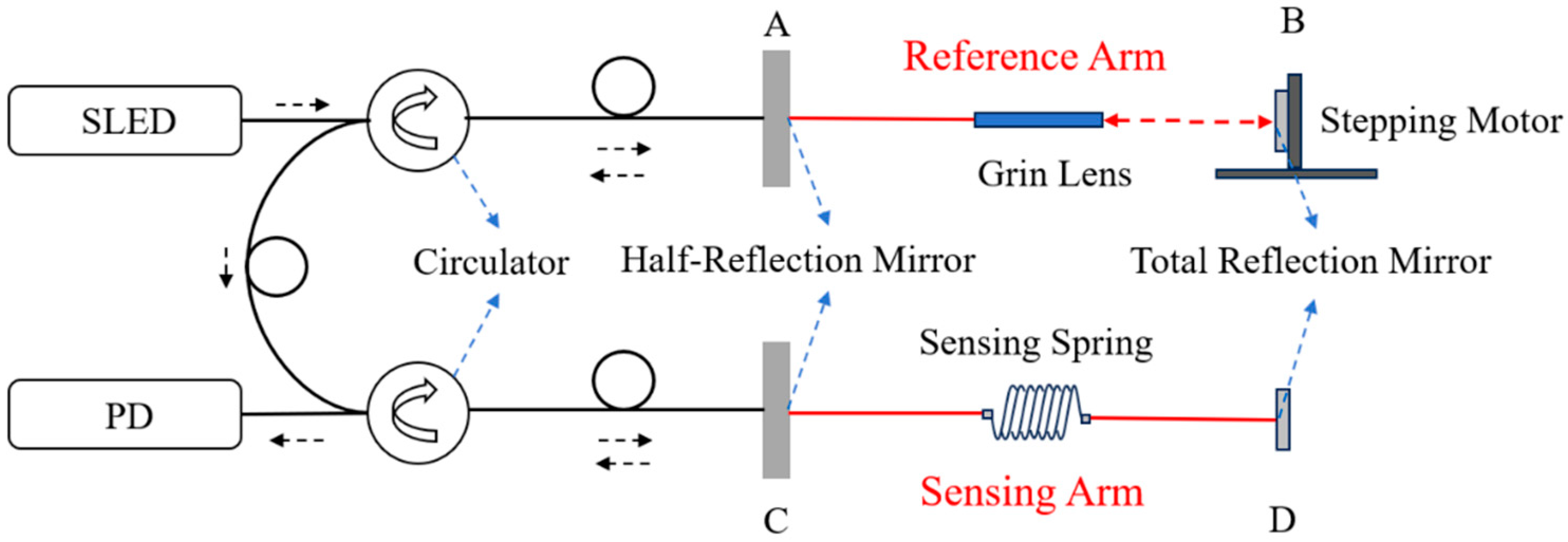 The LCOI is in a Michelson configuration, and the output interference signal reaches its maximum intensity only when the optical path difference (OPD) of the sensing arm, Path 3, along with reference arm, Path 2, tends to zero. This is because the wide spectrum of the SLED bears a short coherent length of approximately 38.14 μ m here [15]. The OPD was controlled through the moving stepping motor, and the position of the stepper motor is used to measure the OPD. According to Equation (4) in Ref. [15], this output interference signal detected by PD can be described as