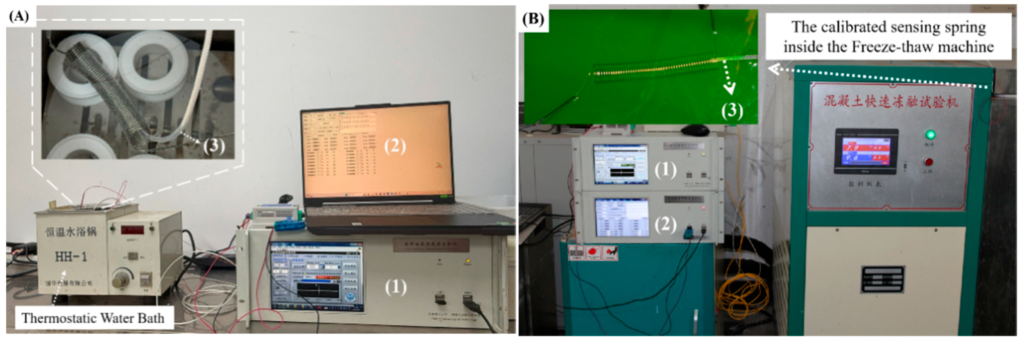 Figure 3. The setup for spring sensor calibration. (A) Calibration test from room temperature to 65 °C; (B) test from room temperature to −25 °C. Both of them shared the same instruments, including (1) the low-coherence interferometer; (2) the PT100 data-acquisition unit; (3) the PT100 temperature sensor.