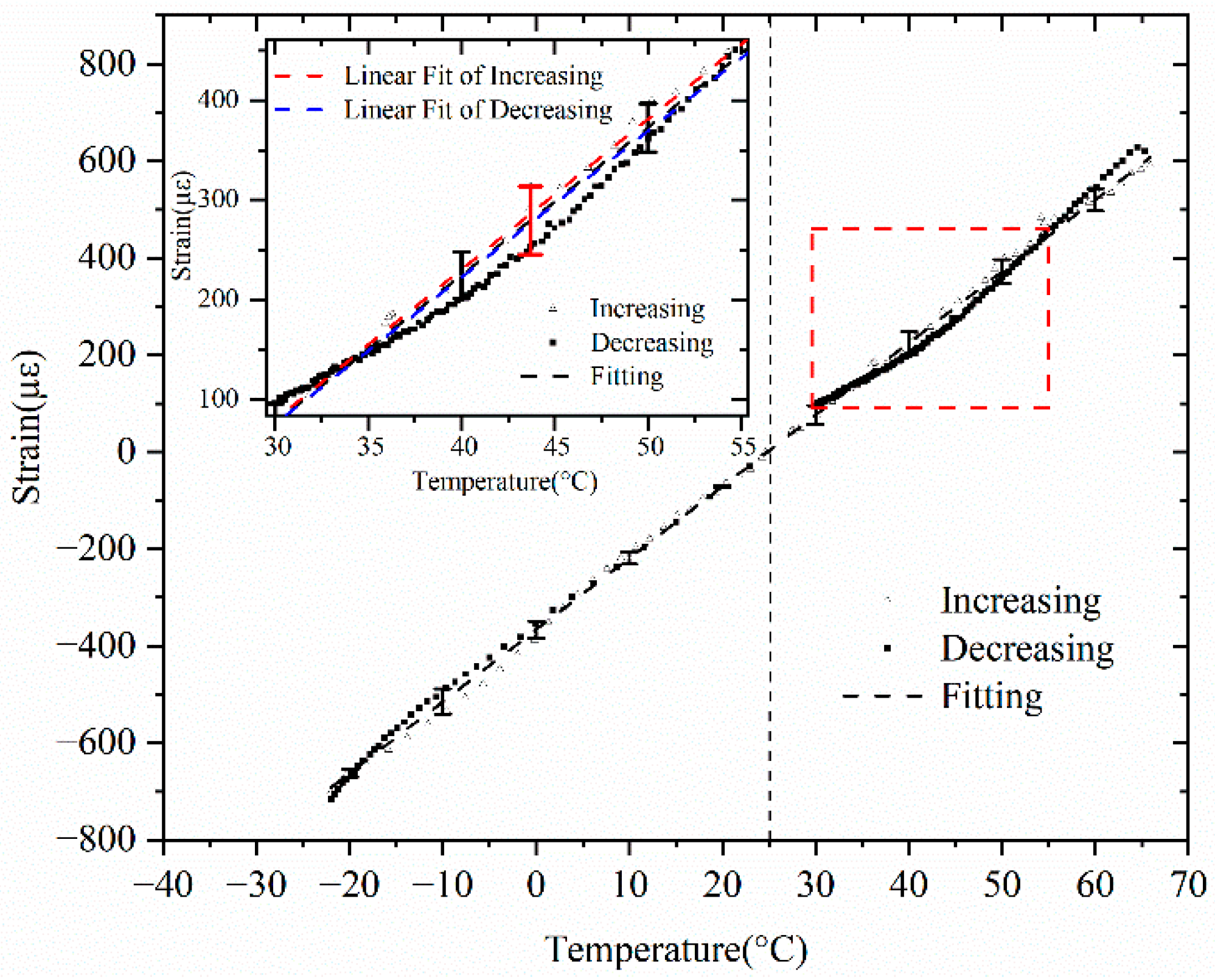 The vertical dashed line represented the room temperature, by which the range of the calibration temperature was separated into the two stages, and the strain from the low-coherent interferometer of each process was normalized as zero and connected to form Figure 4. The right side of the dashed line corresponded to the first stage given by Figure 3A from room temperature to 65 °C; and the left side corresponded to the second stage given by Figure 3B from room temperature to low temperature −25 °C. The insert figure indicated the hysteresis of the strain between the increasing and decreasing temperatures as well as the point of maximum error.