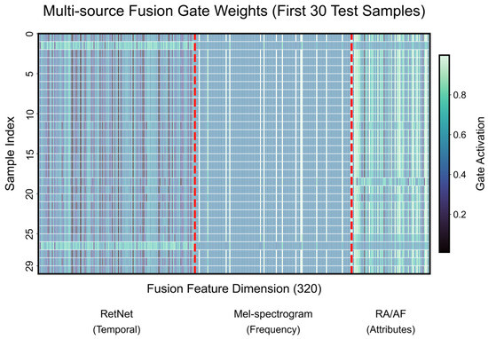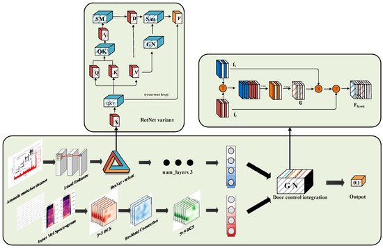Gated fusion is a multimodal information fusion strategy that dynamically adjusts the weights of different modality features through a gating mechanism, thereby achieving adaptive and robust fusion. Its framework is illustrated in Figure 3. The gating mechanism—typically implemented using a Sigmoid activation function—generates weighted gates based on the information entropy or correlation of the input modalities. This enables adaptive feature integration while mitigating the influence of noisy or redundant modalities. In this study, gated fusion is applied to the fusion layer of RetNet to dynamically integrate AE sequence features and audio convolutional features, thereby enhancing the model’s robustness and classification accuracy for multisource signals.
