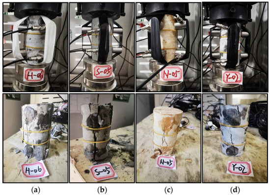 An eight-channel integrated AE detection system was employed to record event parameters and positional information during the uniaxial compression tests of rock specimens. The recording equipment continuously captured acoustic signals under laboratory conditions designed to simulate in situ stress environments. Each lithology specimen exhibited distinct brittle failure characteristics under uniaxial loading, as illustrated in Figure 6. During compression, intermittent AE signals were generated as microcracks initiated and propagated, followed by intense sound bursts corresponding to the onset of macrofracture and ultimate failure. The AE data collected by the integrated detector were stored as temporal sequences, including timestamps, amplitudes, peak frequencies, and energy values. Meanwhile, the audio signals were recorded as continuous waveform data and subsequently processed using the Librosa Python (Version: 0.11.0) library for feature extraction and Mel spectrogram generation.