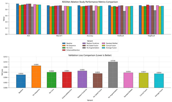 To systematically evaluate the contribution of each component within the RDGNet architecture, several ablation experiments were conducted by sequentially removing or replacing the sequence branch, the convolution branch, the RetNet module, the Focal Loss function, the gated fusion mechanism, and data augmentation as well as introducing variants such as the standard RetNet, concatenation fusion, and average fusion models. The experiments were performed on the augmented dataset, trained for 30 epochs with a batch size of 512, using the AdamW optimizer with a learning rate of 5 × 10−5. Evaluation metrics included the area under the receiver operating characteristic (ROC) curve (AUC–ROC), Macro F1 score, accuracy, positive and negative recall, and the optimal decision threshold (determined via ROC curve optimization). The complete RDGNet configuration served as the baseline model.