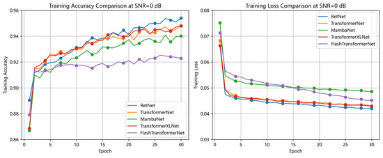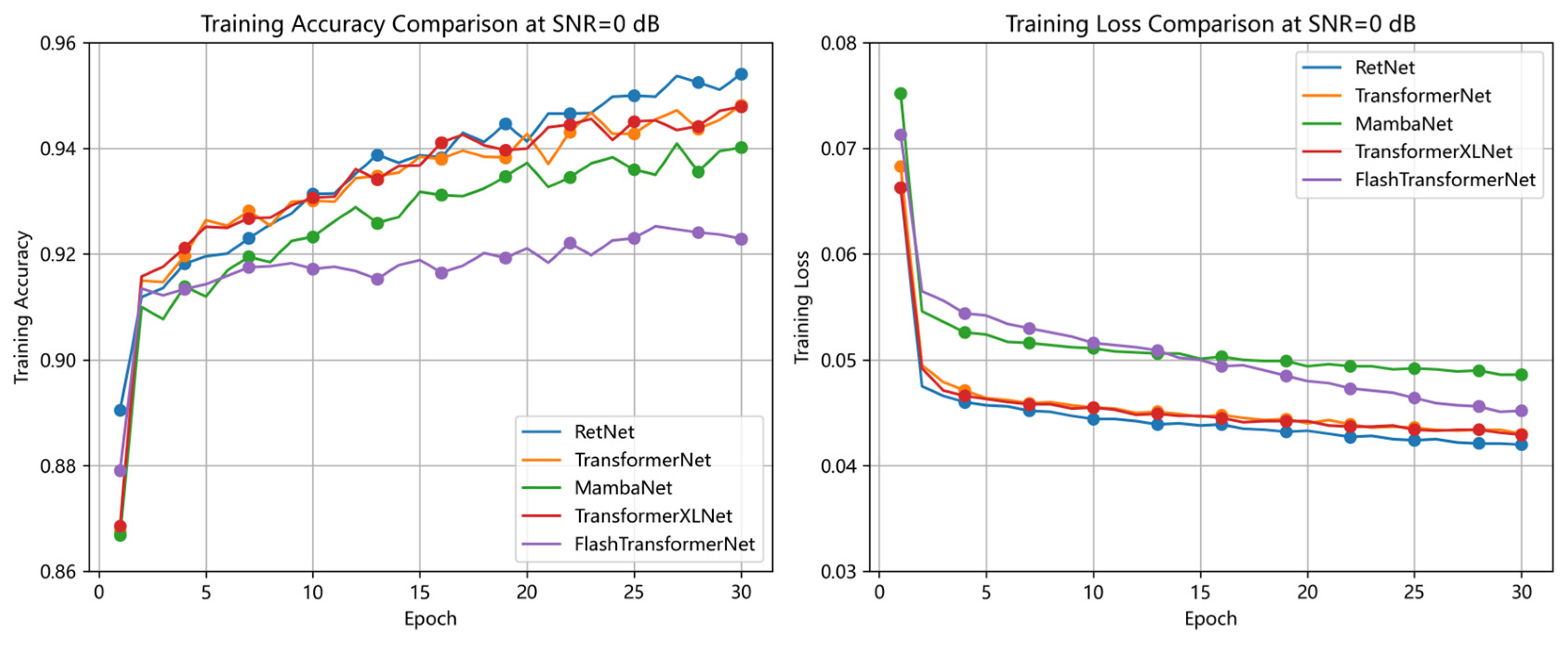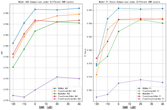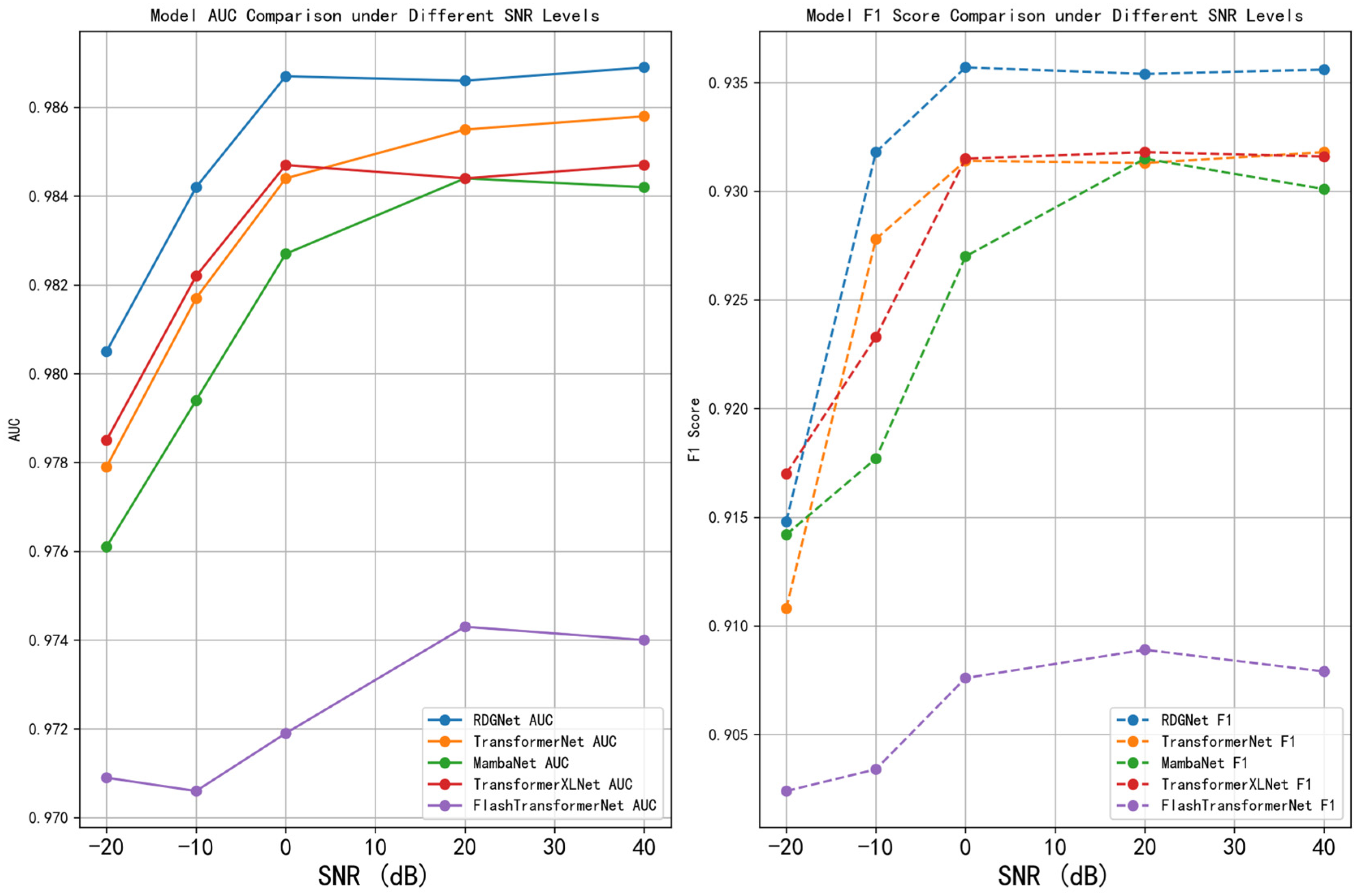 To evaluate the robustness of the RDGNet model under noisy conditions and its superiority over baseline architectures, this section presents two experimental analyses: noise experiments and model comparisons. In the noise experiments, Gaussian noise was added to the test set at SNR levels of −20, −10, 0, 20, and 40 dB, and performance was evaluated using AUC and Macro F1 metrics. For the model comparison, several baseline models were implemented: TransformerNet (replacing the RetNet module with a Transformer layer), MambaNet (replacing RetNet with a Mamba layer), TransformerXLNet (replacing RetNet with a TransformerXLNet layer), and FlashTransformerNet (adopting an FlashAttention + Transformer structure in the sequence branch and a multiscale convolution module in the convolution branch). These baselines were chosen as representative sequence modeling alternatives to demonstrate the advantages of RetNet-based sequence processing. All models were trained using the same augmented dataset and identical hyperparameter settings (30 epochs, batch size = 512, learning rate = 5 × 10−5, AdamW optimizer).