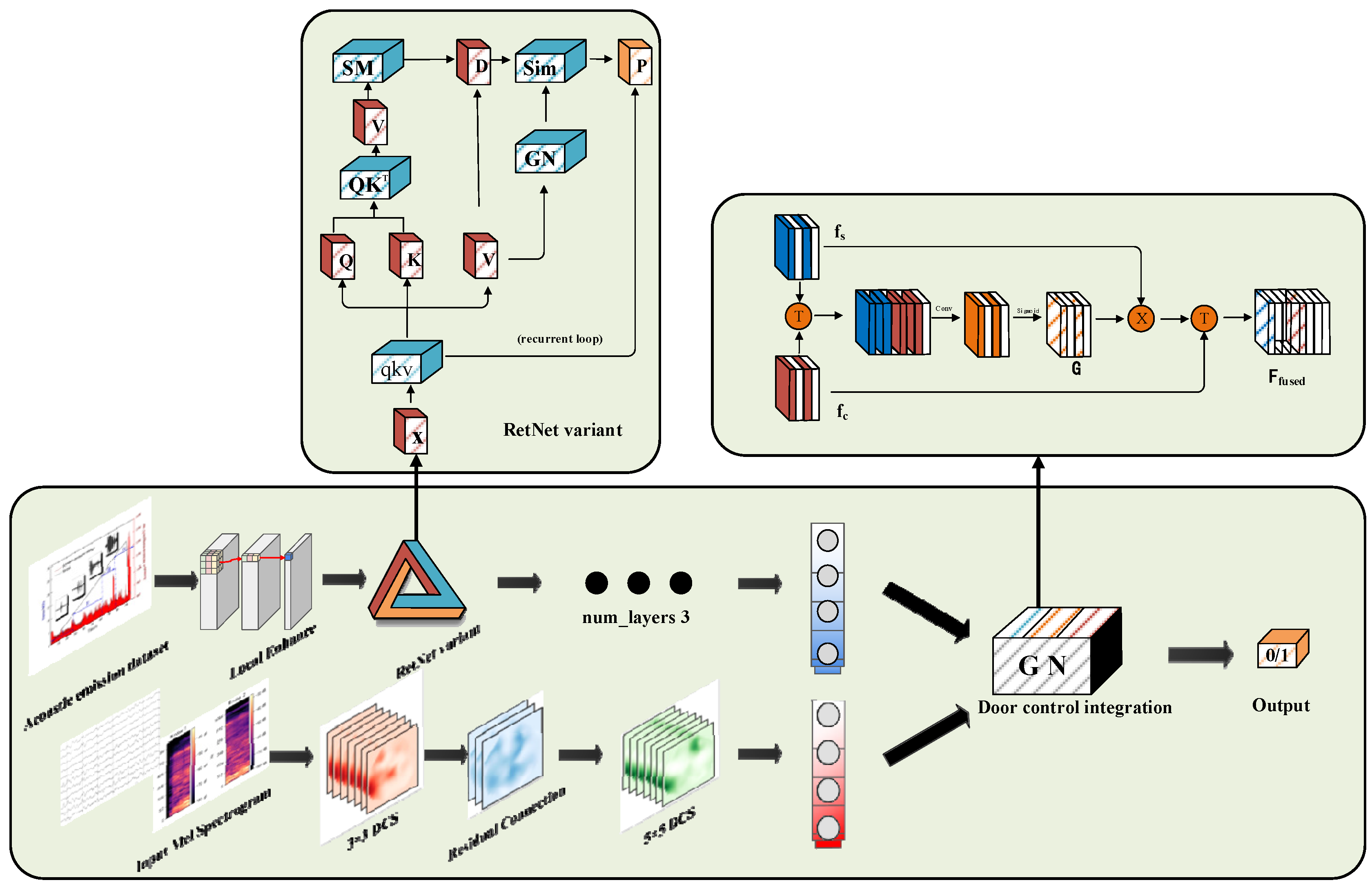 Furthermore, like the standard RetNet, the variant retains support for parallel training and recurrent inference. However, in the standard RetNet, mode switching is typically implemented implicitly within the computational formulas, which can introduce efficiency losses in mixed training–inference pipelines. In contrast, the variant adopts an explicit mode-switching mechanism controlled by dedicated parameters. For example, it utilizes Einstein summation (einsum) operations for efficient computation, transitioning from “SM” through “D” to “Sim” in parallel mode, while iteratively updating states from the Q, K, and V branches in recurrent mode. The framework defaults to parallel mode during training to maximize throughput and switches to recurrent mode during inference to reduce memory consumption. This explicit control mechanism significantly decreases inference latency while preserving compatibility with the original RetNet’s computational complexity. Collectively, these optimizations enhance the model’s robustness, real-time performance, and stability when processing noise-dense AE sequences in multimodal fusion tasks.