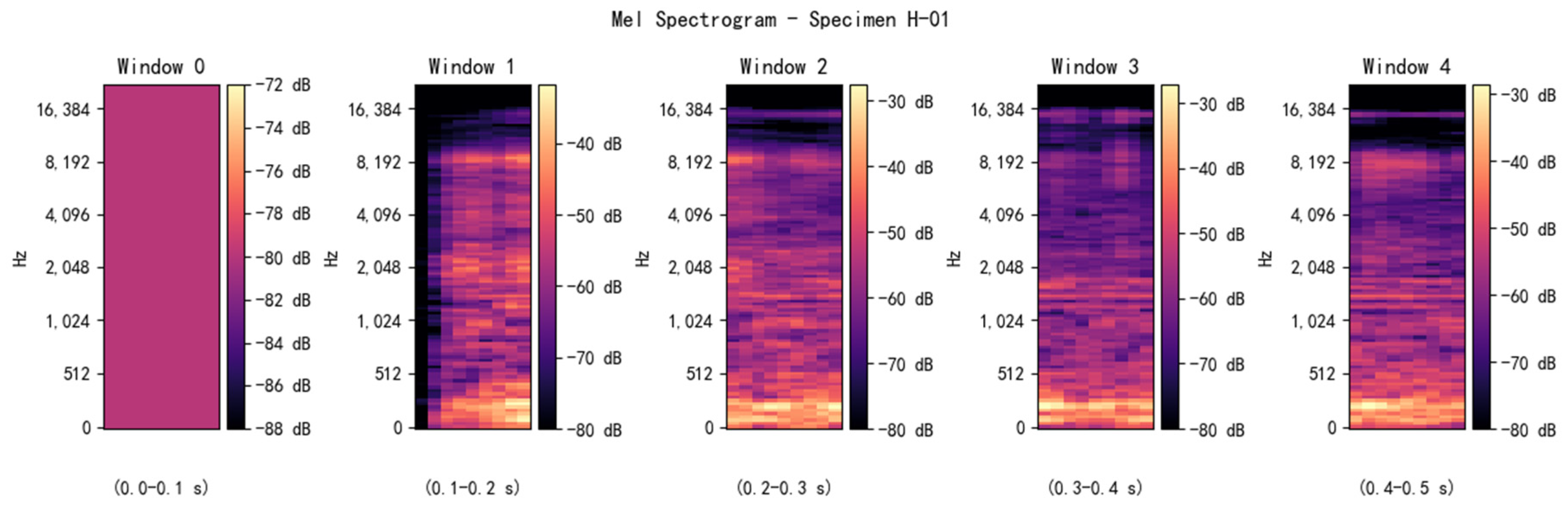 Figure 6. During compression, intermittent AE signals were generated as microcracks initiated and propagated, followed by intense sound bursts corresponding to the onset of macrofracture and ultimate failure. The AE data collected by the integrated detector were stored as temporal sequences, including timestamps, amplitudes, peak frequencies, and energy values. Meanwhile, the audio signals were recorded as continuous waveform data and subsequently processed using the Librosa Python (Version: 0.11.0) library for feature extraction and Mel spectrogram generation.