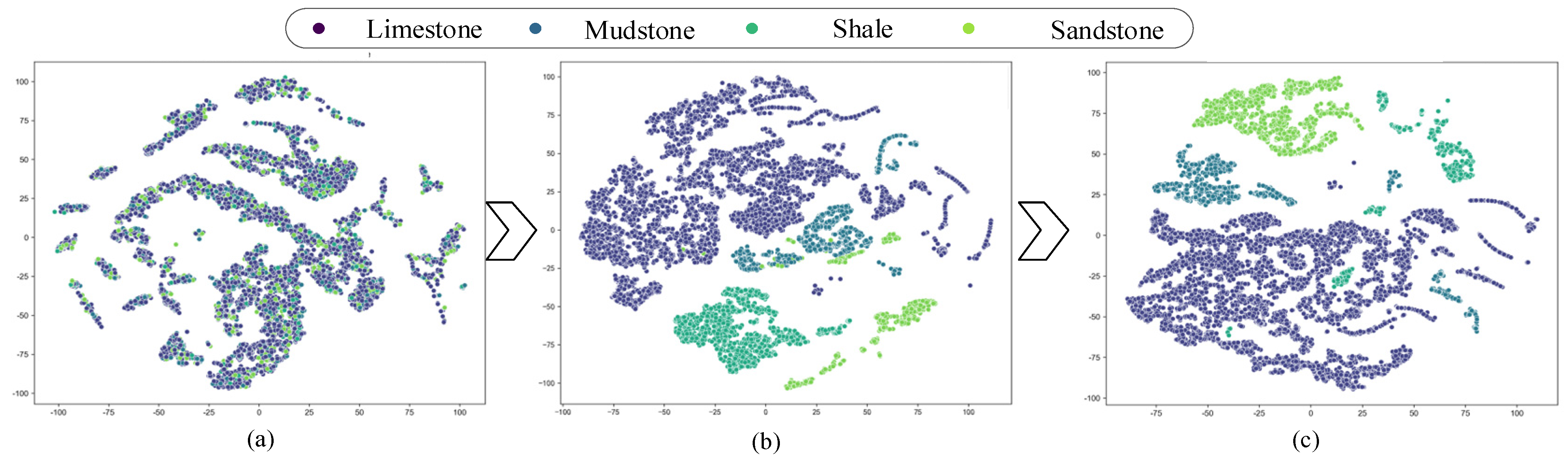 Figure 9, after feature extraction by the sequence branch, the limestone and sandstone samples were almost completely separated from other lithologies, whereas considerable overlap remained between the mudstone and shale samples. This observation suggests that the preliminary sequence features had limited discriminative ability for minority lithologies. After modal weight recalibration through the gated fusion mechanism, the number of overlapping samples was markedly reduced, demonstrating an improvement in lithology discrimination. The final classifier outputs, shown in
