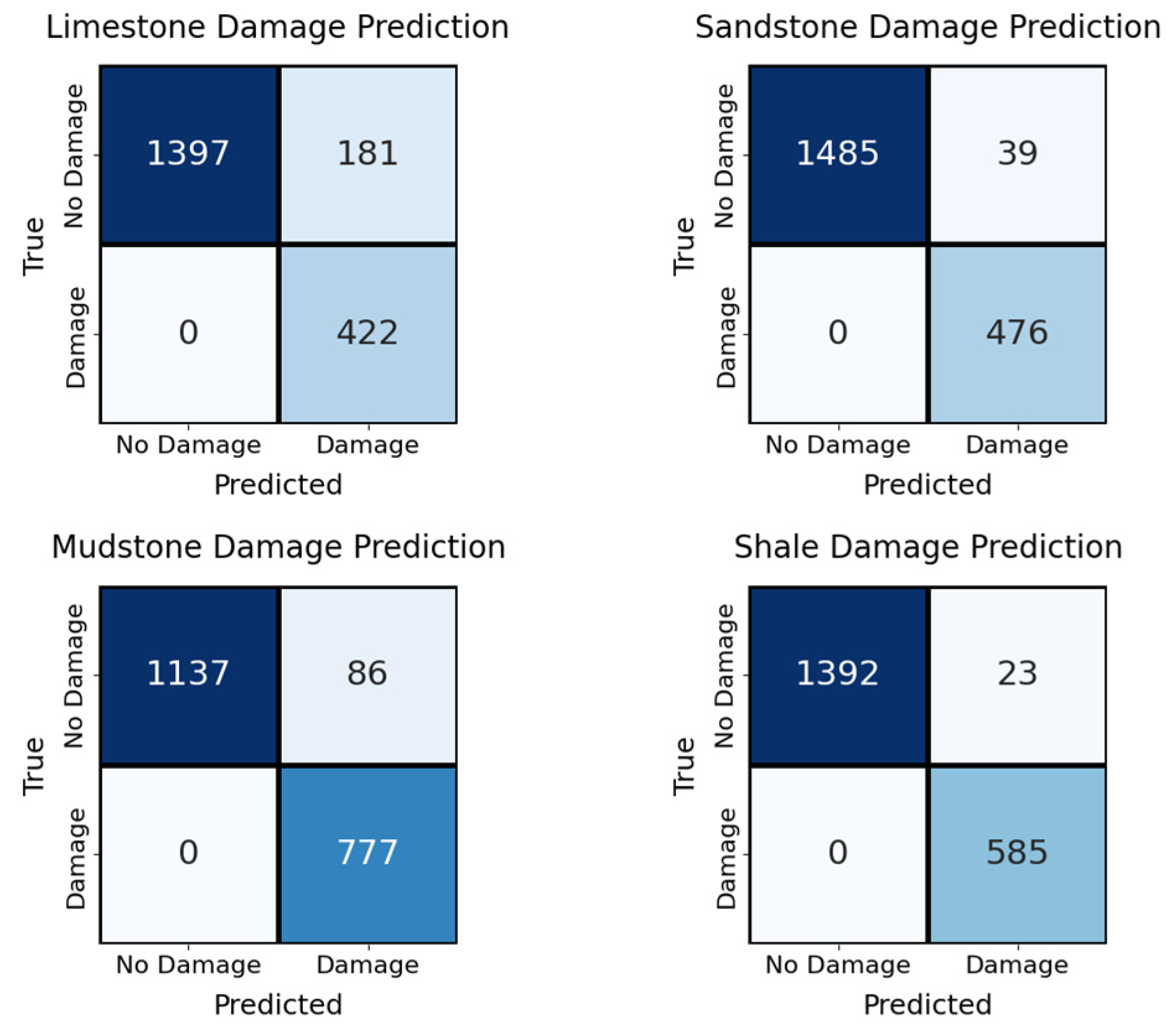 Figure 12 shows the confusion matrices for the damage prediction of each lithology;